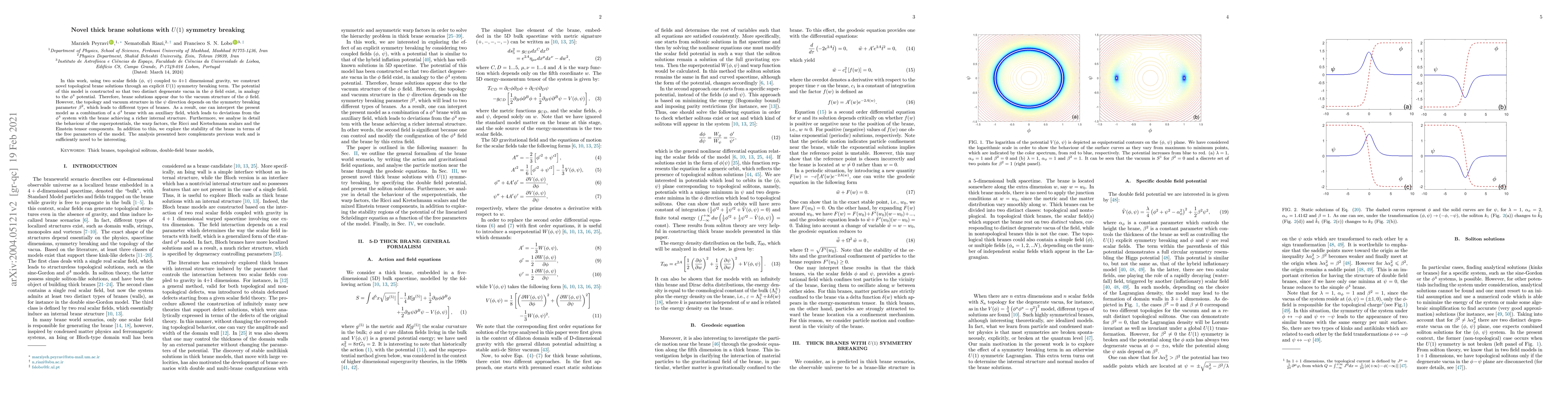 In this work, using two scalar fields ($\phi$, $\psi$) coupled to 4+1 dimensional gravity, we construct novel topological brane solutions through an explicit $U(1)$ symmetry breaking term. The potential of this model is constructed so that two distinct degenerate vacua in the $\phi$ field exist, in analogy to the $\phi^{4}$ potential. Therefore, brane solutions appear due to the vacuum structure of the $\phi$ field. However, the topology and vacuum structure in the $\psi$ direction depends on the symmetry breaking parameter $\beta^{2}$, which leads to different types of branes. As a result, one can interpret the present model as a combination of a $\phi^{4}$ brane with an auxiliary field, which leads to deviations from the $\phi^{4}$ system with the brane achieving a richer internal structure. Furthermore, we analyse in detail the behaviour of the superpotentials, the warp factors, the Ricci and Kretschmann scalars and the Einstein tensor components. In addition to this, we explore the stability of the brane in terms of the free parameters of the model. The analysis presented here complements previous work and is sufficiently novel to be interesting.