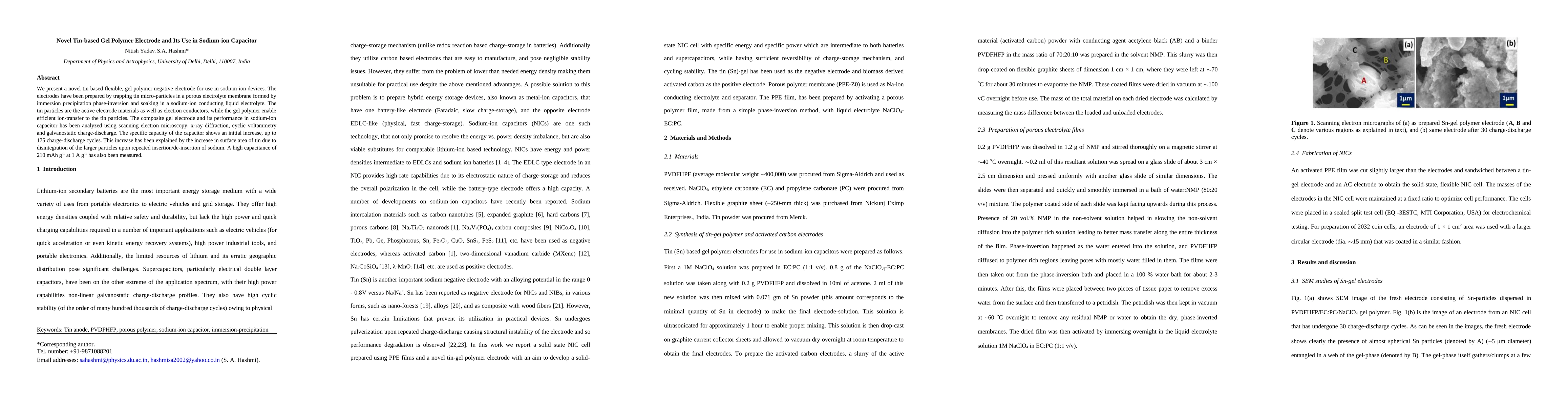 This paper introduces a novel tin-based gel polymer electrode for sodium-ion capacitors, showing improved performance due to increased surface area from tin particle disintegration. The electrode exhibits a high capacitance of 210 mAh g-1 at 1 A g-1 and maintains capacity over 175 cycles.