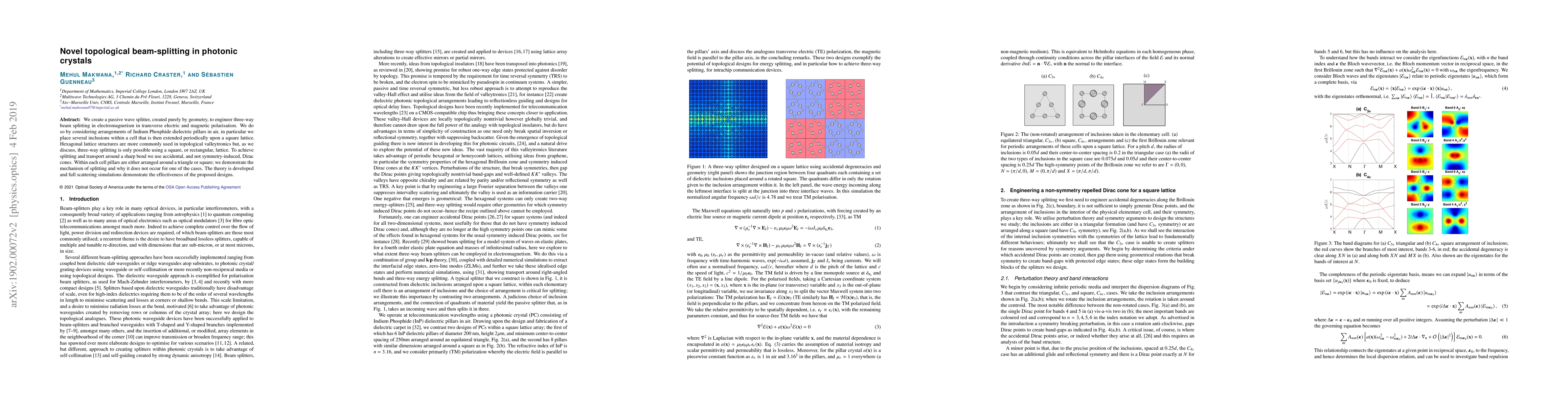 We create a passive wave splitter, created purely by geometry, to engineer three-way beam splitting in electromagnetism in transverse electric polarisation. We do so by considering arrangements of Indium Phosphide dielectric pillars in air, in particular we place several inclusions within a cell that is then extended periodically upon a square lattice. Hexagonal lattice structures more commonly used in topological valleytronics but, as we discuss, three-way splitting is only possible using a square, or rectangular, lattice. To achieve splitting and transport around a sharp bend we use accidental, and not symmetry-induced, Dirac cones. Within each cell pillars are either arranged around a triangle or square; we demonstrate the mechanism of splitting and why it does not occur for one of the cases. The theory is developed and full scattering simulations demonstrate the effectiveness of the proposed designs.