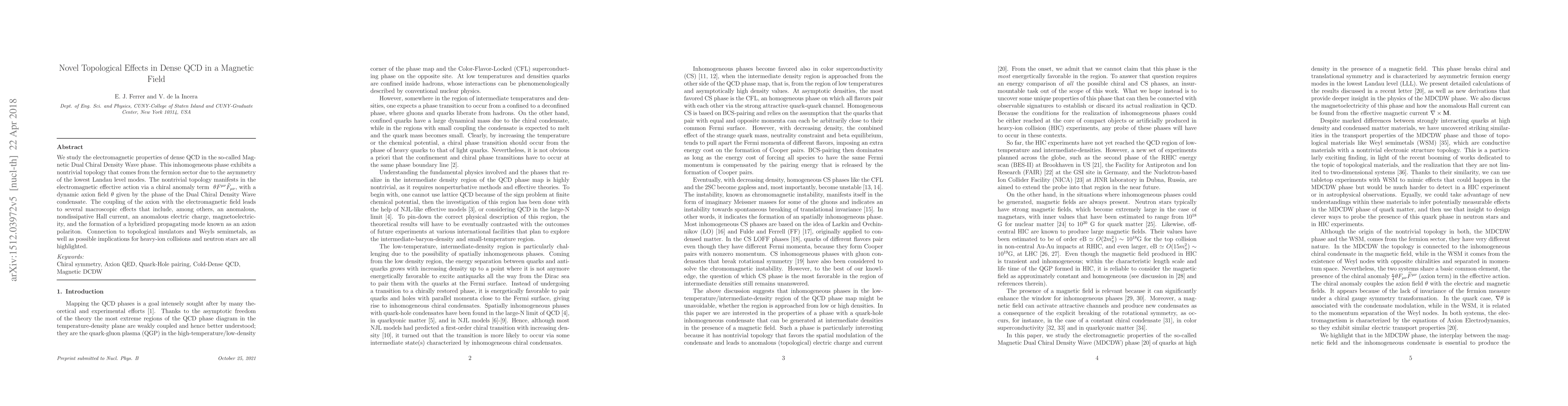 We study the electromagnetic properties of dense QCD in the so-called Magnetic Dual Chiral Density Wave phase. This inhomogeneous phase exhibits a nontrivial topology that comes from the fermion sector due to the asymmetry of the lowest Landau level modes. The nontrivial topology manifests in the electromagnetic effective action via a chiral anomaly term $~\theta F^{\mu\nu}\tilde{F}_{\mu\nu}$, with a dynamic axion field $\theta$ given by the phase of the dual chiral density wave condensate. The coupling of the axion with the electromagnetic field leads to several macroscopic effects that include, among others, an anomalous, nondissipative Hall current, an anomalous electric charge, magnetoelectricity, and the formation of a hybridized propagating mode known as an axion polariton. Connection to topological insulators and Weyls semimetals, as well as possible implications for heavy-ion collisions and neutron stars are all highlighted.