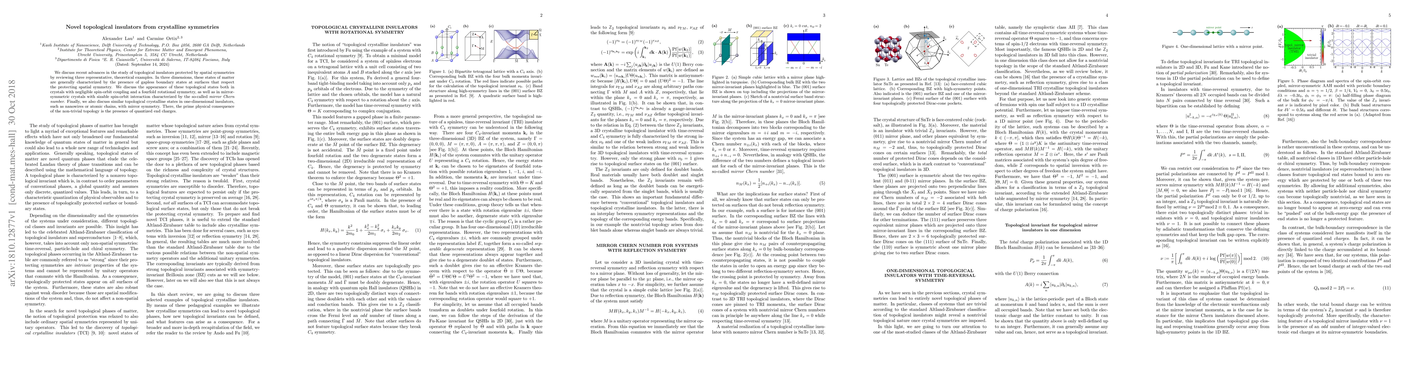 The paper explores novel topological insulators, a class of materials with unique surface states, protected by crystalline symmetries. It discusses three-dimensional examples with rotational and mirror symmetries, and one-dimensional insulators like nanowires, highlighting quantized end charges as a key topological consequence.