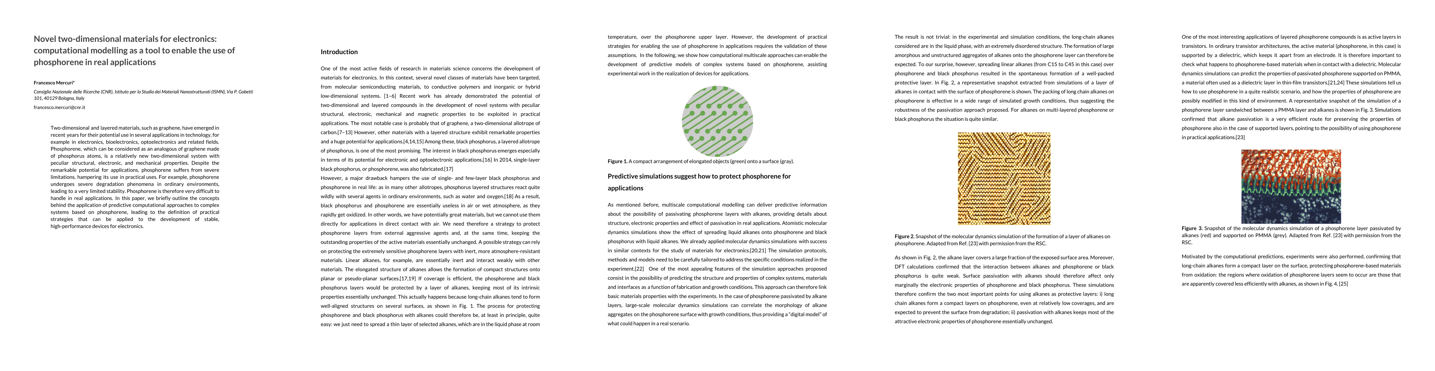 Two-dimensional and layered materials, such as graphene, have emerged in recent years for their potential use in several applications in technology, for example in electronics, bioelectronics, optoelectronics and related fields. Phosphorene, which can be considered as an analogous of graphene made of phosphorus atoms, is a relatively new two-dimensional system with peculiar structural, electronic, and mechanical properties. Despite the remarkable potential for applications, phosphorene suffers from severe limitations, hampering its use in practical uses. For example, phosphorene undergoes severe degradation phenomena in ordinary environments, leading to a very limited stability. Phosphorene is therefore very difficult to handle in real applications. In this paper, we briefly outline the concepts behind the application of predictive computational approaches to complex systems based on phosphorene, leading to the definition of practical strategies that can be applied to the development of stable, high-performance devices for electronics.