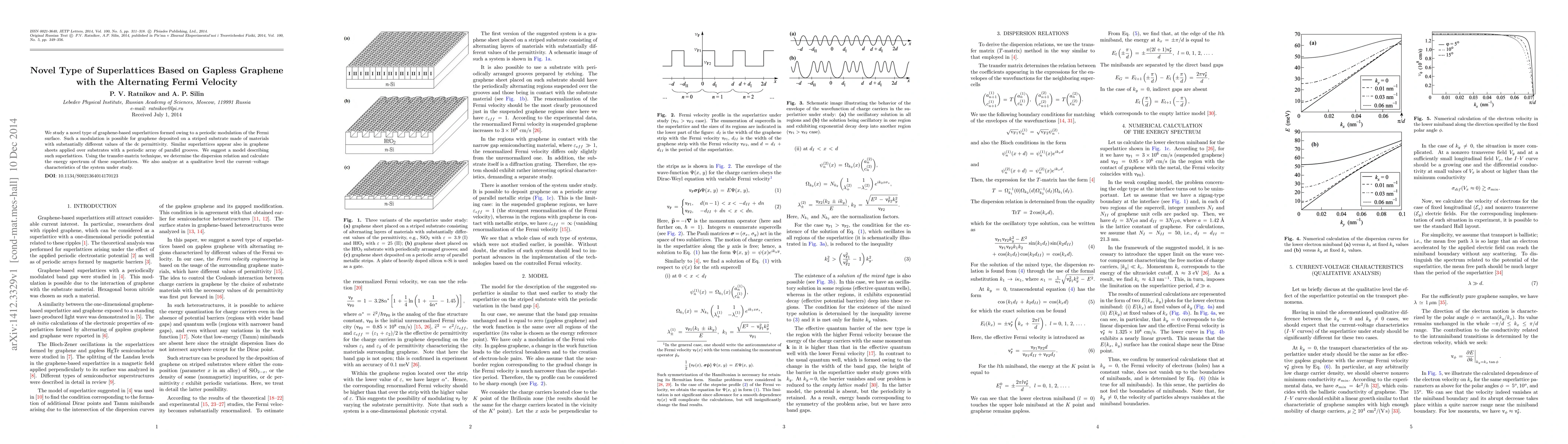 We study a novel type of graphene-based superlattices formed owing to a periodic modulation of the Fermi surface. Such a modulation is possible for graphene deposited on a striped substrate made of materials with substantially different values of the dc permittivity. Similar superlattices appear also in graphene sheets applied over substrates with a periodic array of parallel grooves. We suggest a model describing such superlattices. Using the transfer-matrix technique, we determine the dispersion relation and calculate the energy spectrum of these superlattices. We also analyze at a qualitative level the current--voltage characteristics of the system under study.