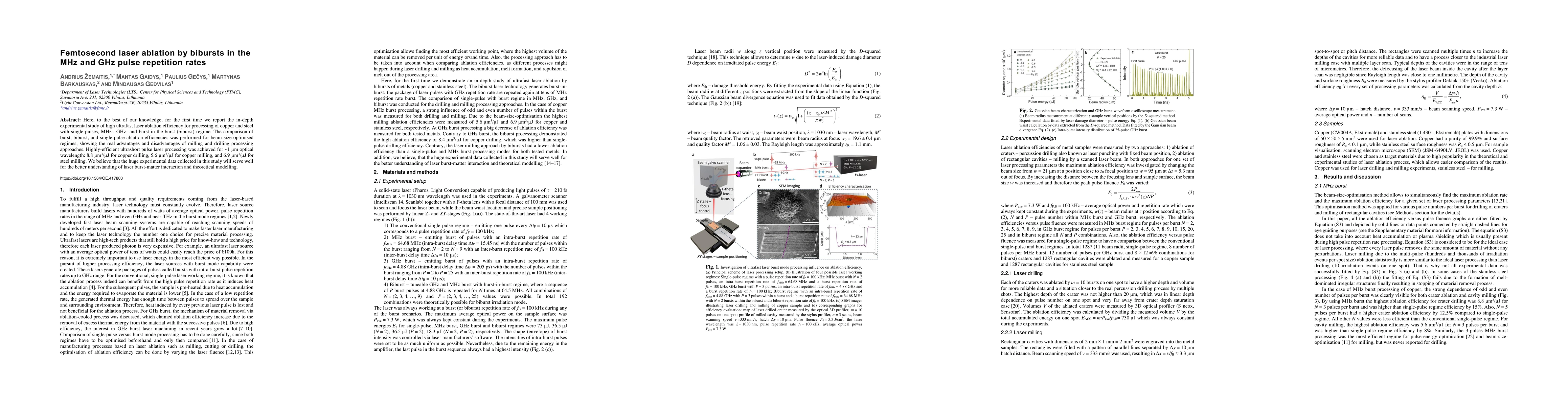 This paper reports an experimental study on ultrafast laser ablation using MHz and GHz pulse repetition rates, specifically biburst regimes, for processing copper and steel. The study demonstrates highly efficient laser processing, achieving rates of 8.8 µm³/µJ for copper drilling, 5.6 µm³/µJ for copper milling, and 6.9 µm³/µJ for steel milling, and provides insights into the advantages and disadvantages of different milling and drilling approaches.