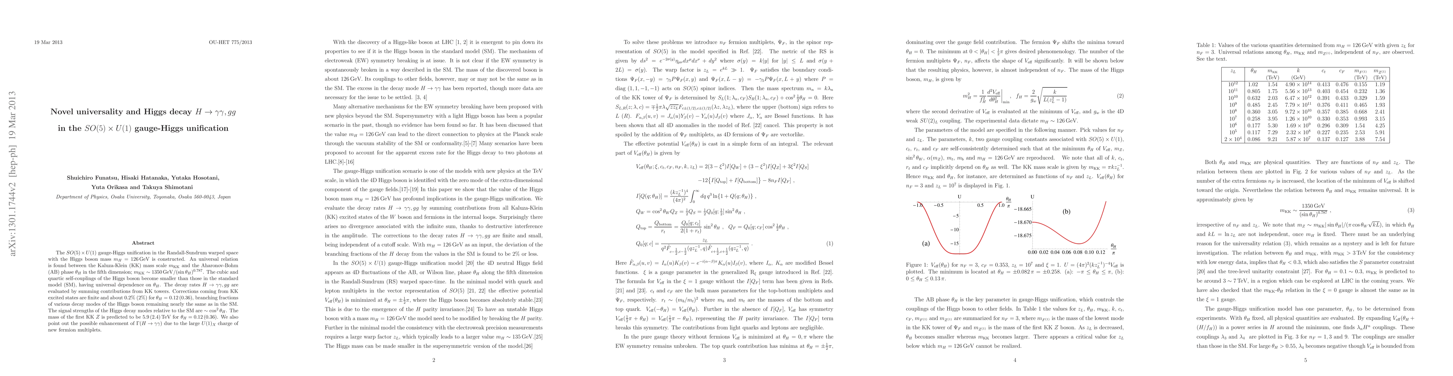 This paper constructs an SO(5) x U(1) gauge-Higgs unification model in Randall-Sundrum warped space, finding a universal relation between the KK mass scale and the AB phase. It predicts smaller Higgs self-couplings and nearly unchanged decay rates, with signal strengths relative to the SM proportional to $cos^2 \theta_H$.