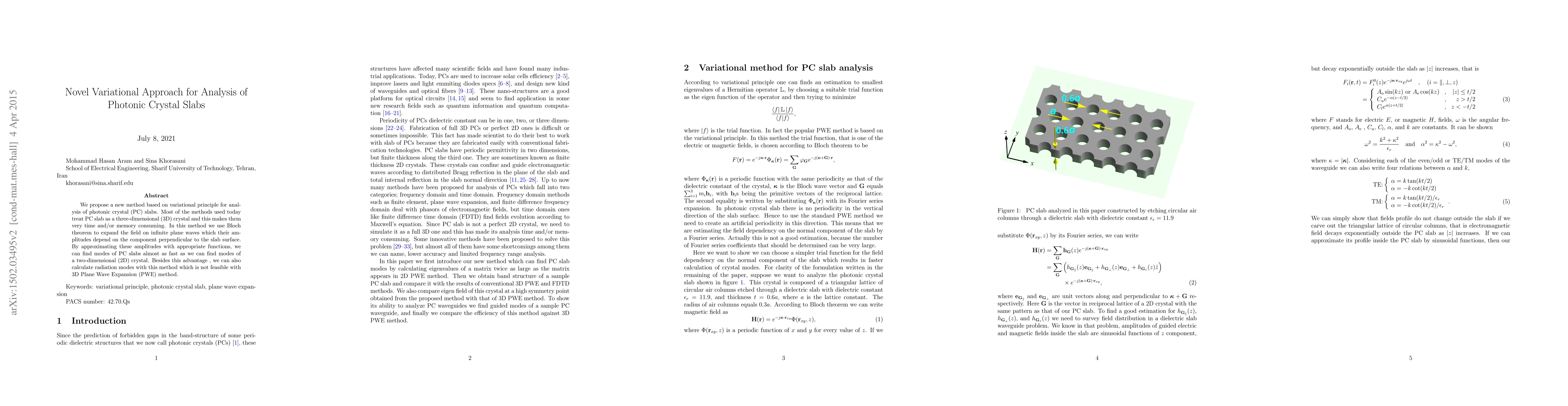 We propose a new method based on variational principle for analysis of photonic crystal (PC) slabs. Most of the methods used today treat PC slab as a three-dimensional (3D) crystal and this makes them very time and/or memory consuming. In this method we use Bloch theorem to expand the field on infinite plane waves which their amplitudes depend on the component perpendicular to the slab surface. By approximating these amplitudes with appropriate functions, we can find modes of PC slabs almost as fast as we can find modes of a two-dimensional (2D) crystal. Besides this advantage, we can also calculate radiation modes with this method which is not feasible with 3D Plane Wave Expansion (PWE) method.