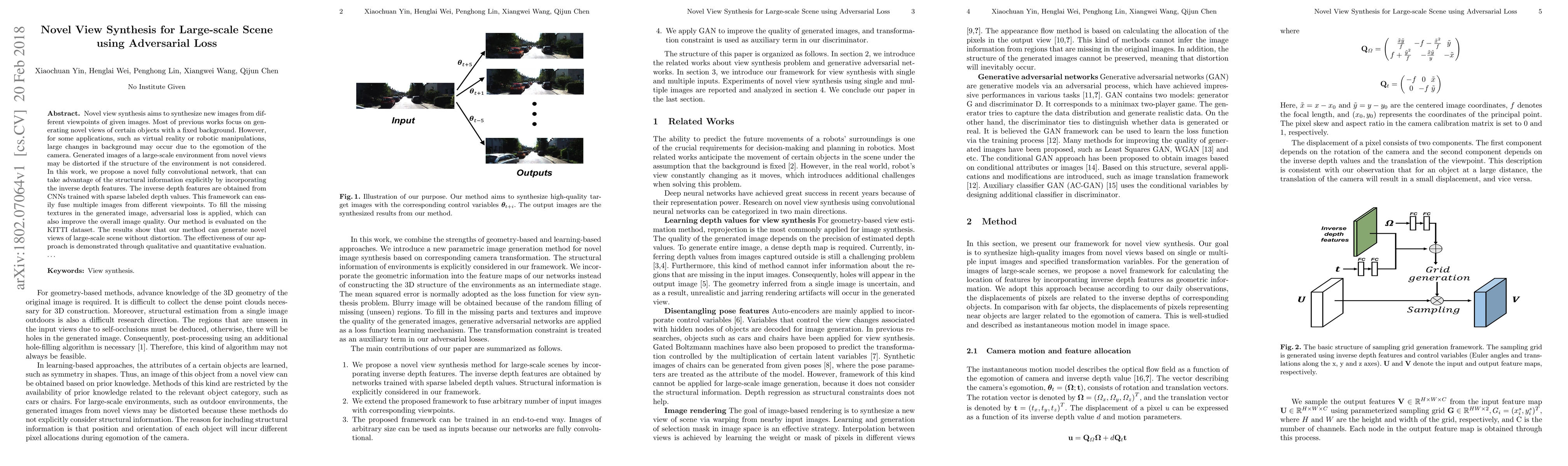 This paper proposes a novel fully convolutional network for generating high-quality images of large-scale scenes from different viewpoints without distorting the environment's structure. It uses inverse depth features and adversarial loss to improve image quality and demonstrate its effectiveness on the KITTI dataset.