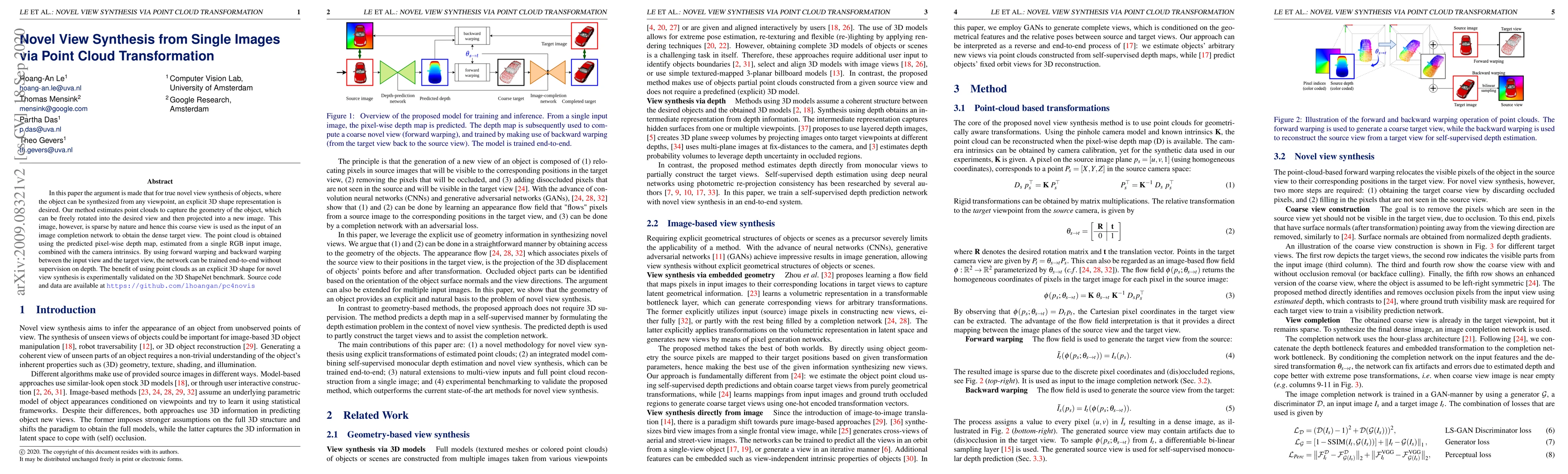 This paper proposes a method for novel view synthesis from single images using point cloud transformation, where a point cloud captures the object's geometry and is rotated to synthesize a new view, followed by image completion to obtain a dense output. The method is trained end-to-end without supervision on depth and validated on the 3D ShapeNet benchmark.