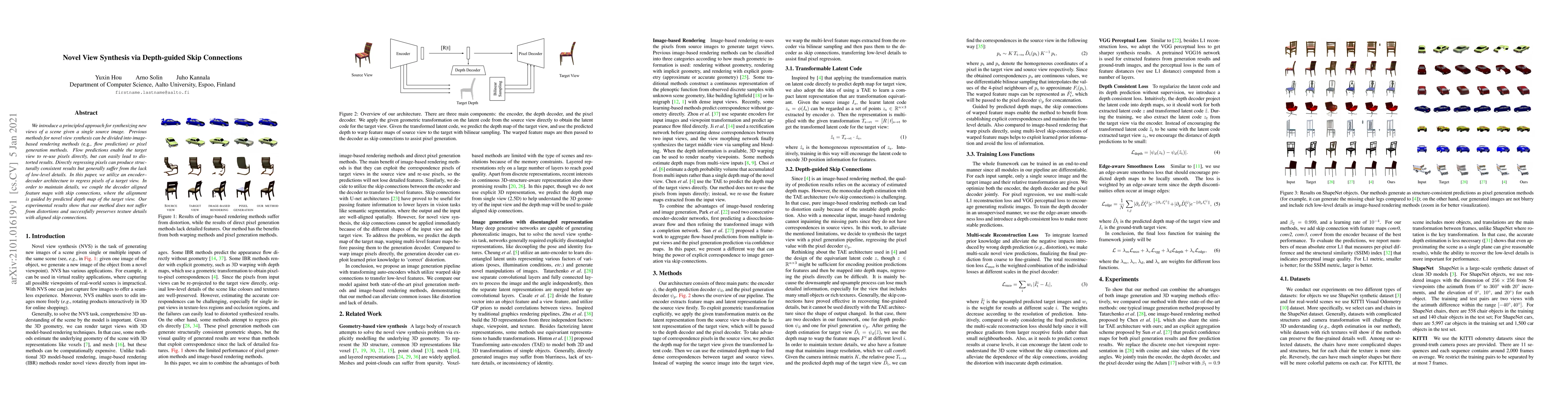 This paper proposes a novel view synthesis method using depth-guided skip connections in an encoder-decoder architecture to generate new views from a single source image. The approach combines depth map predictions with skip connections to preserve texture details while avoiding distortions.