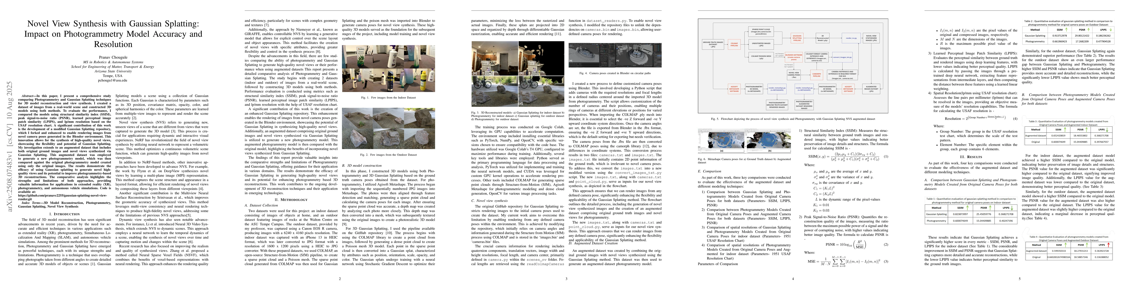 In this paper, I present a comprehensive study comparing Photogrammetry and Gaussian Splatting techniques for 3D model reconstruction and view synthesis. I created a dataset of images from a real-world scene and constructed 3D models using both methods. To evaluate the performance, I compared the models using structural similarity index (SSIM), peak signal-to-noise ratio (PSNR), learned perceptual image patch similarity (LPIPS), and lp/mm resolution based on the USAF resolution chart. A significant contribution of this work is the development of a modified Gaussian Splatting repository, which I forked and enhanced to enable rendering images from novel camera poses generated in the Blender environment. This innovation allows for the synthesis of high-quality novel views, showcasing the flexibility and potential of Gaussian Splatting. My investigation extends to an augmented dataset that includes both original ground images and novel views synthesized via Gaussian Splatting. This augmented dataset was employed to generate a new photogrammetry model, which was then compared against the original photogrammetry model created using only the original images. The results demonstrate the efficacy of using Gaussian Splatting to generate novel high-quality views and its potential to improve photogrammetry-based 3D reconstructions. The comparative analysis highlights the strengths and limitations of both approaches, providing valuable information for applications in extended reality (XR), photogrammetry, and autonomous vehicle simulations. Code is available at https://github.com/pranavc2255/gaussian-splatting-novel-view-render.git.