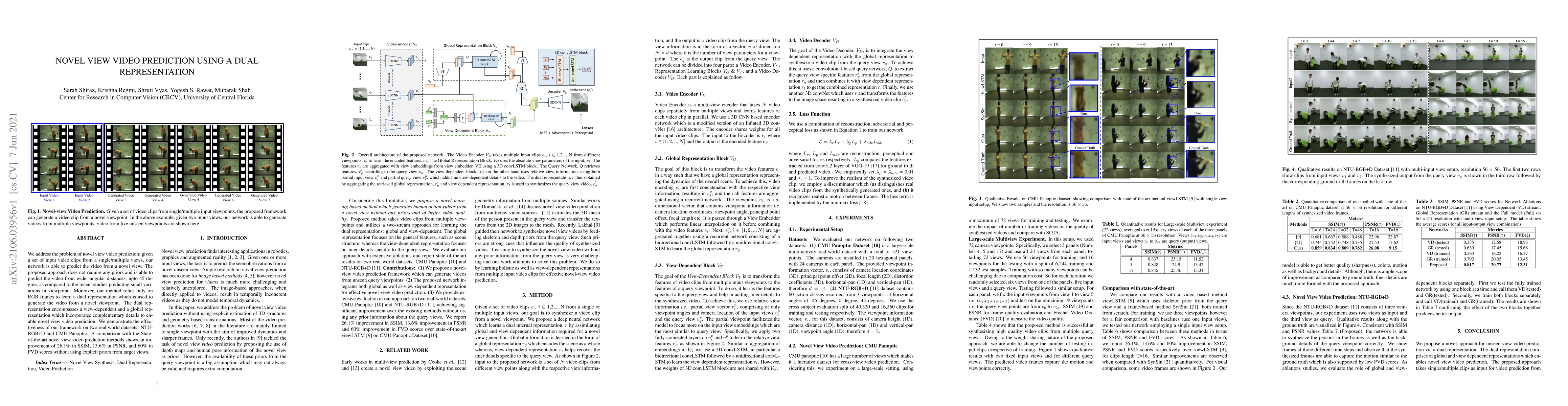 We address the problem of novel view video prediction; given a set of input video clips from a single/multiple views, our network is able to predict the video from a novel view. The proposed approach does not require any priors and is able to predict the video from wider angular distances, upto 45 degree, as compared to the recent studies predicting small variations in viewpoint. Moreover, our method relies only onRGB frames to learn a dual representation which is used to generate the video from a novel viewpoint. The dual representation encompasses a view-dependent and a global representation which incorporates complementary details to enable novel view video prediction. We demonstrate the effectiveness of our framework on two real world datasets: NTU-RGB+D and CMU Panoptic. A comparison with the State-of-the-art novel view video prediction methods shows an improvement of 26.1% in SSIM, 13.6% in PSNR, and 60% inFVD scores without using explicit priors from target views.