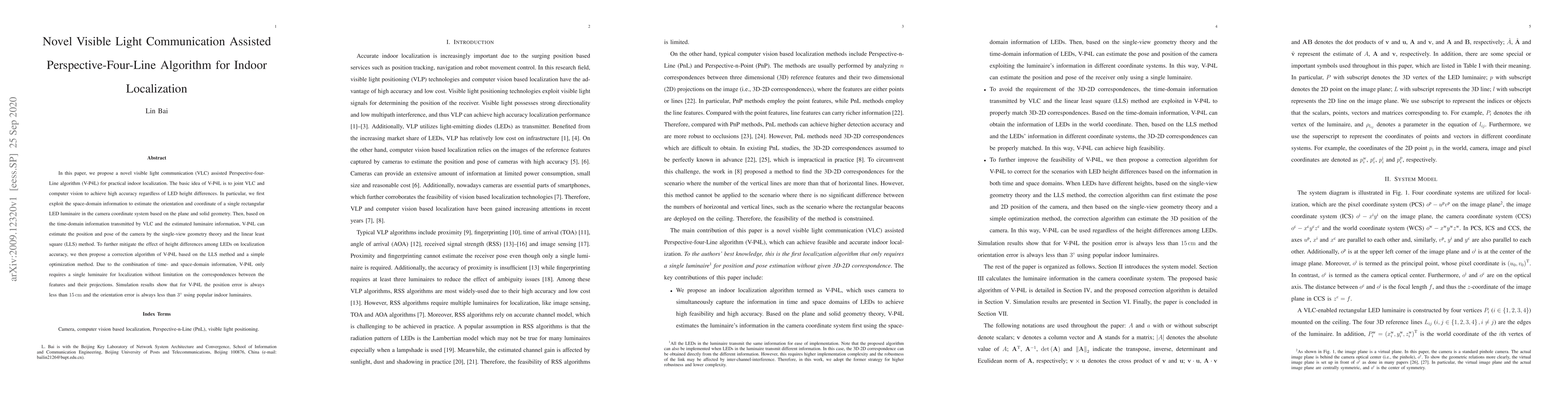 This paper introduces a novel visible light communication (VLC) assisted Perspective-fourLine (V-P4L) algorithm for indoor localization, combining VLC and computer vision to achieve high accuracy regardless of LED height differences. The method estimates the position and orientation of a single LED luminaire, then uses time-domain VLC information and linear least square methods to determine camera position and pose, achieving sub-15 cm position error and less than 3° orientation error.