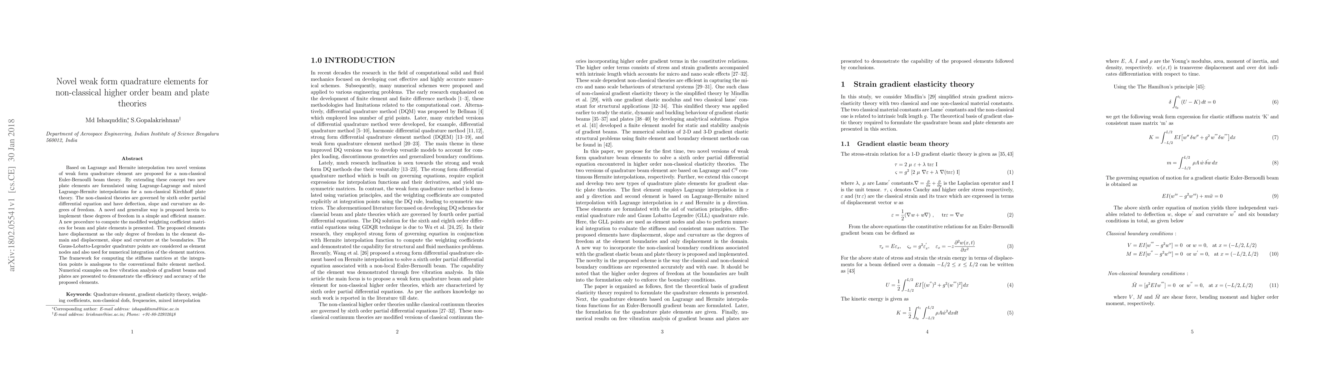Based on Lagrange and Hermite interpolation two novel versions of weak form quadrature element are proposed for a non-classical Euler-Bernoulli beam theory. By extending these concept two new plate elements are formulated using Lagrange-Lagrange and mixed Lagrange-Hermite interpolations for a non-classical Kirchhoff plate theory. The non-classical theories are governed by sixth order partial differential equation and have deflection, slope and curvature as de- grees of freedom. A novel and generalize way is proposed herein to implement these degrees of freedom in a simple and efficient manner. A new procedure to compute the modified weighting coefficient matri- ces for beam and plate elements is presented. The proposed elements have displacement as the only degree of freedom in the element do- main and displacement, slope and curvature at the boundaries. The Gauss-Lobatto-Legender quadrature points are considered as element nodes and also used for numerical integration of the element matrices. The framework for computing the stiffness matrices at the integra- tion points is analogous to the conventional finite element method. Numerical examples on free vibration analysis of gradient beams and plates are presented to demonstrate the efficiency and accuracy of the proposed elements.