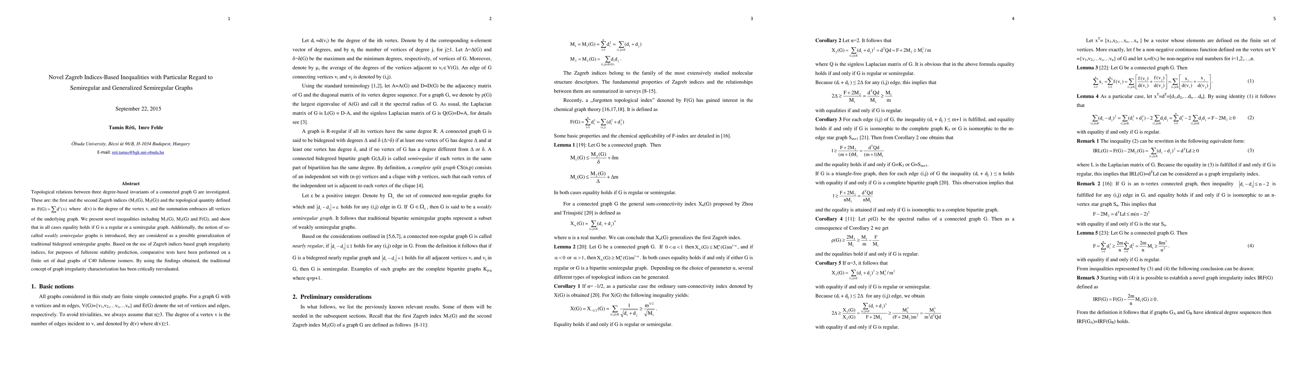 Topological relations between three degree-based invariants of a connected graph G are investigated. We present novel inequalities including M1(G), M2(G) and F(G), and show that in all cases equality holds if G is a regular or a semiregular graph. Additionally, the notion of so called weakly semiregular graphs is introduced, they are considered as a possible generalization of traditional bidegreed semiregular graphs. Based on the use of Zagreb indices based graph irregularity indices, for purposes of fullerene stability prediction, comparative tests have been performed on a finite set of dual graphs of C40 fullerene isomers. By using the findings obtained, the traditional concept of graph irregularity characterization has been critically reevaluated.
