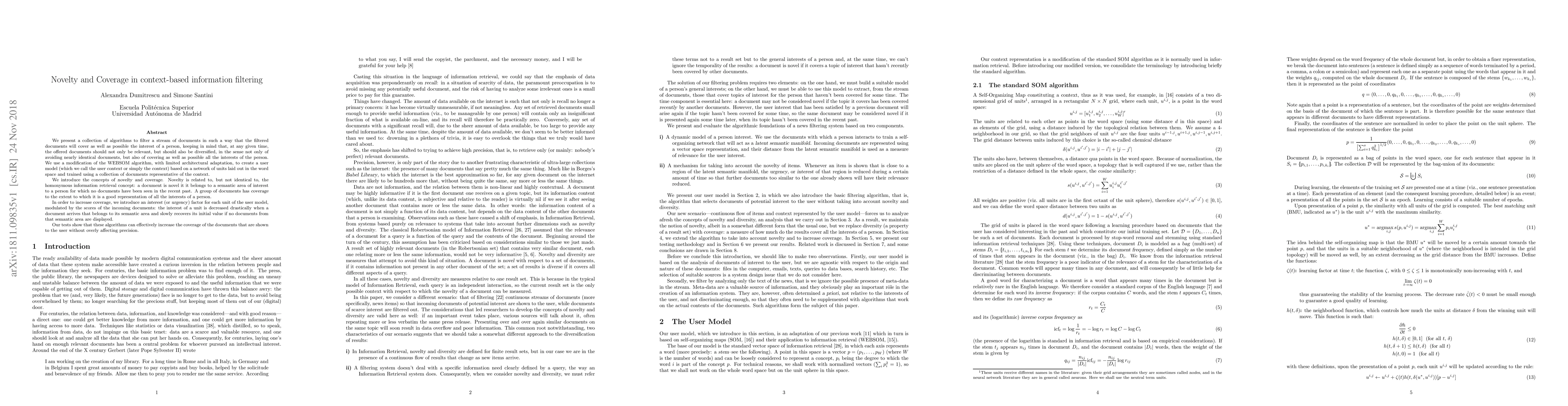 We present a collection of algorithms to filter a stream of documents in such a way that the filtered documents will cover as well as possible the interest of a person, keeping in mind that, at any given time, the offered documents should not only be relevant, but should also be diversified, in the sense not only of avoiding nearly identical documents, but also of covering as well as possible all the interests of the person. We use a modification of the WEBSOM algorithm, with limited architectural adaptation, to create a user model (which we call the "user context" or simply the "context") based on a network of units laid out in the word space and trained using a collection of documents representative of the context. We introduce the concepts of novelty and coverage. Novelty is related to, but not identical to, the homonymous information retrieval concept: a document is novel it it belongs to a semantic area of interest to a person for which no documents have been seen in the recent past. A group of documents has coverage to the extent to which it is a good representation of all the interests of a person. In order to increase coverage, we introduce an "interest" (or "urgency") factor for each unit of the user model, modulated by the scores of the incoming documents: the interest of a unit is decreased drastically when a document arrives that belongs to its semantic area and slowly recovers its initial value if no documents from that semantic area are displayed. Our tests show that these algorithms can effectively increase the coverage of the documents that are shown to the user without overly affecting precision.