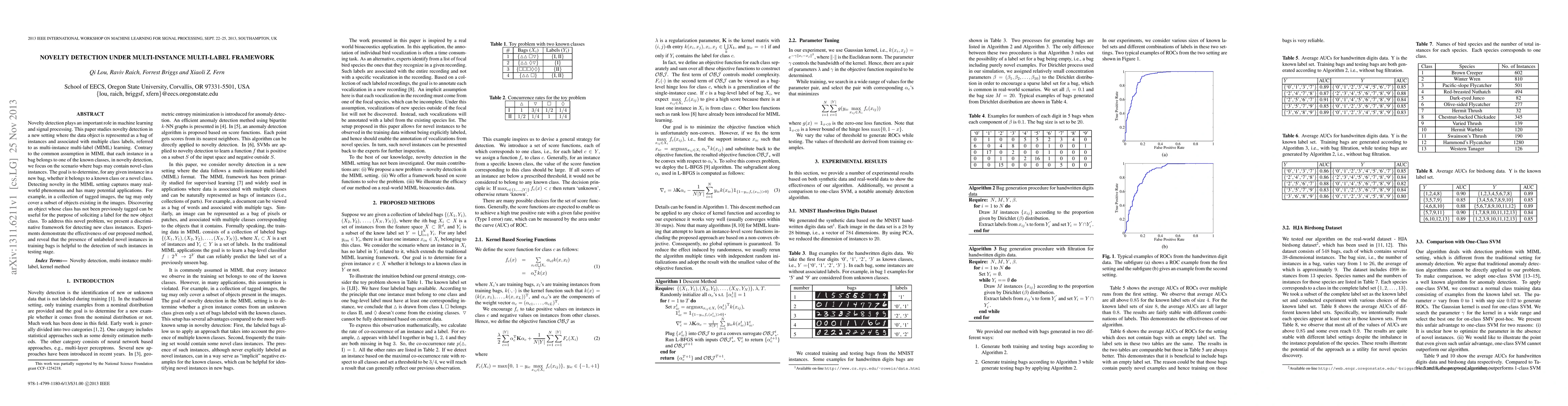 Novelty detection plays an important role in machine learning and signal processing. This paper studies novelty detection in a new setting where the data object is represented as a bag of instances and associated with multiple class labels, referred to as multi-instance multi-label (MIML) learning. Contrary to the common assumption in MIML that each instance in a bag belongs to one of the known classes, in novelty detection, we focus on the scenario where bags may contain novel-class instances. The goal is to determine, for any given instance in a new bag, whether it belongs to a known class or a novel class. Detecting novelty in the MIML setting captures many real-world phenomena and has many potential applications. For example, in a collection of tagged images, the tag may only cover a subset of objects existing in the images. Discovering an object whose class has not been previously tagged can be useful for the purpose of soliciting a label for the new object class. To address this novel problem, we present a discriminative framework for detecting new class instances. Experiments demonstrate the effectiveness of our proposed method, and reveal that the presence of unlabeled novel instances in training bags is helpful to the detection of such instances in testing stage.