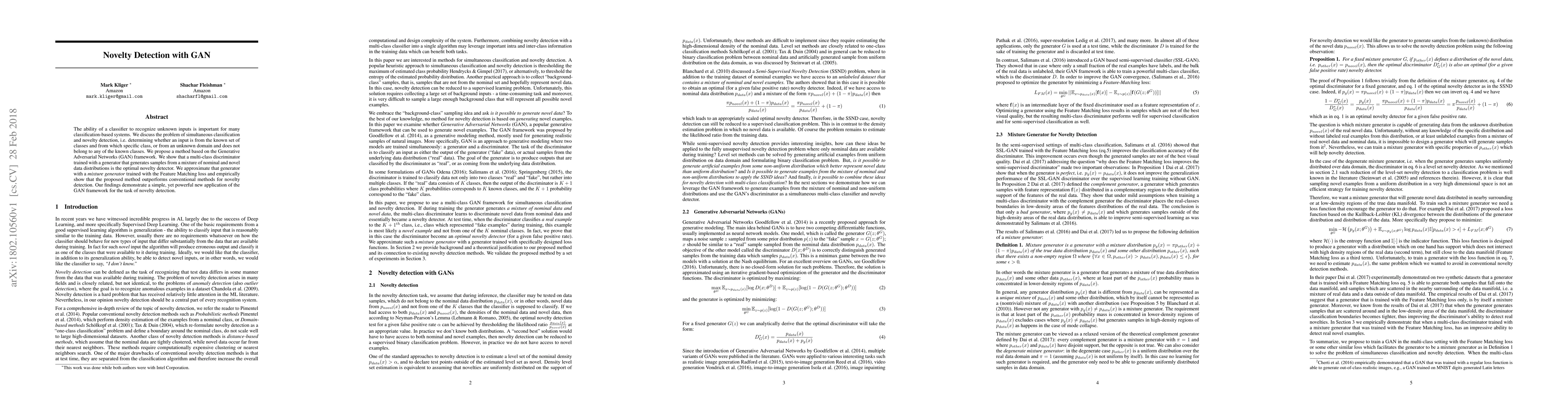 The ability of a classifier to recognize unknown inputs is important for many classification-based systems. We discuss the problem of simultaneous classification and novelty detection, i.e. determining whether an input is from the known set of classes and from which specific class, or from an unknown domain and does not belong to any of the known classes. We propose a method based on the Generative Adversarial Networks (GAN) framework. We show that a multi-class discriminator trained with a generator that generates samples from a mixture of nominal and novel data distributions is the optimal novelty detector. We approximate that generator with a mixture generator trained with the Feature Matching loss and empirically show that the proposed method outperforms conventional methods for novelty detection. Our findings demonstrate a simple, yet powerful new application of the GAN framework for the task of novelty detection.