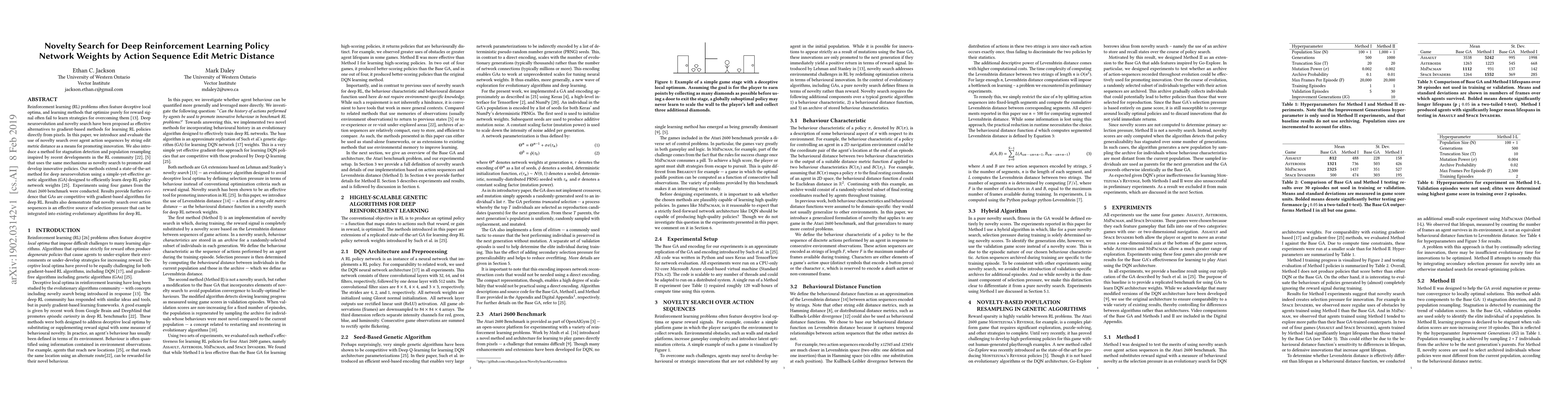This paper proposes using novelty search based on action sequence edit metric distance to promote innovation in deep reinforcement learning policies. It introduces a method for detecting stagnation and resampling, extending a state-of-the-art deep neuroevolution approach with a genetic algorithm, and demonstrates its effectiveness through experiments on Atari 2600 games.