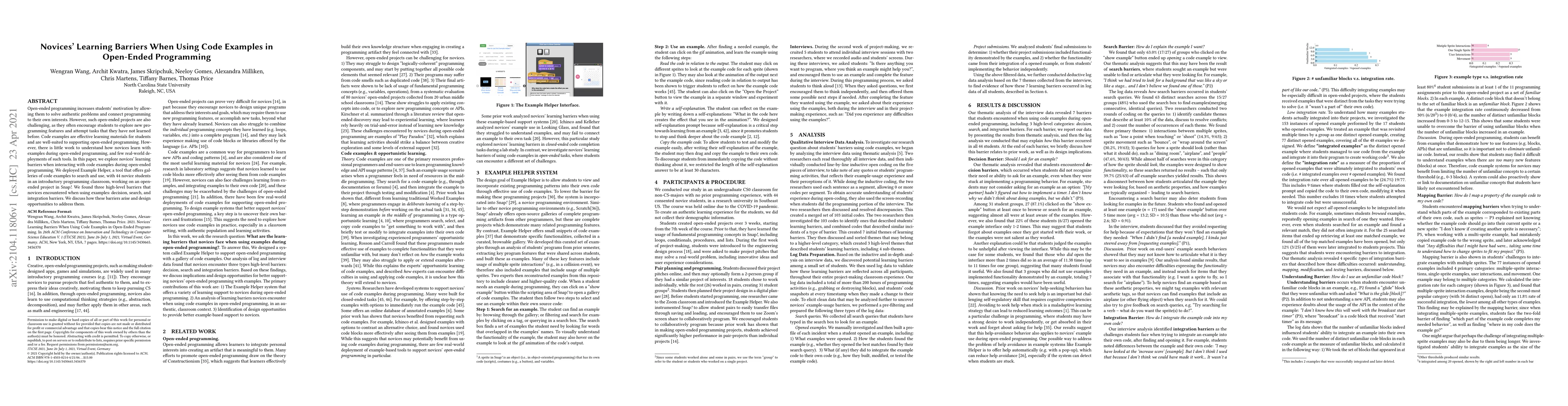 This paper investigates novice programmers' learning challenges when using code examples in open-ended programming projects. The study identifies three main barriers: decision, search, and integration, and proposes solutions to mitigate these issues.