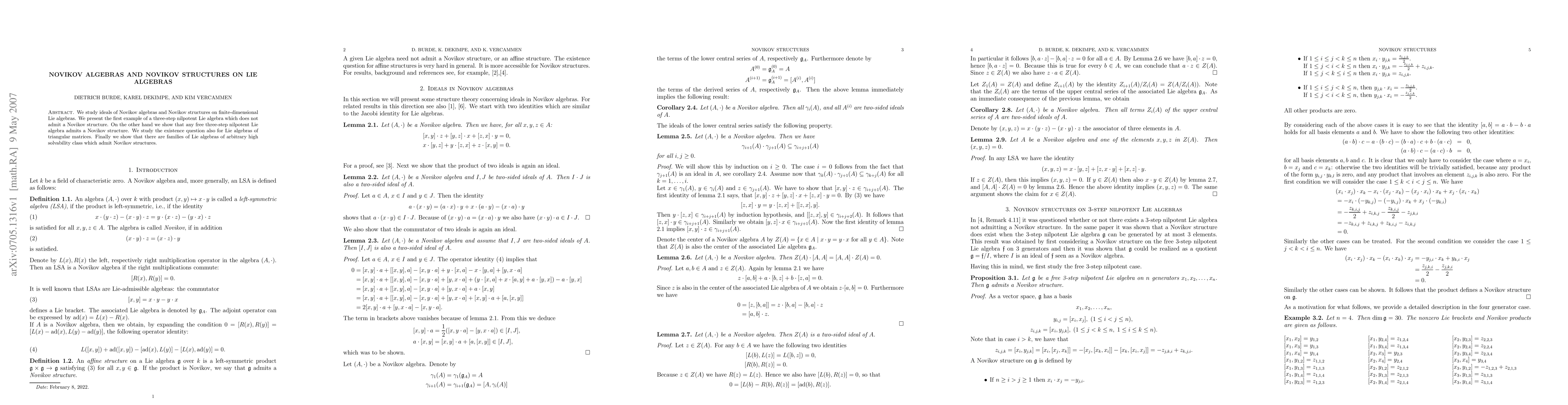 We study ideals of Novikov algebras and Novikov structures on finite-dimensional Lie algebras. We present the first example of a three-step nilpotent Lie algebra which does not admit a Novikov structure. On the other hand we show that any free three-step nilpotent Lie algebra admits a Novikov structure. We study the existence question also for Lie algebras of triangular matrices. Finally we show that there are families of Lie algebras of arbitrary high solvability class which admit Novikov structures.