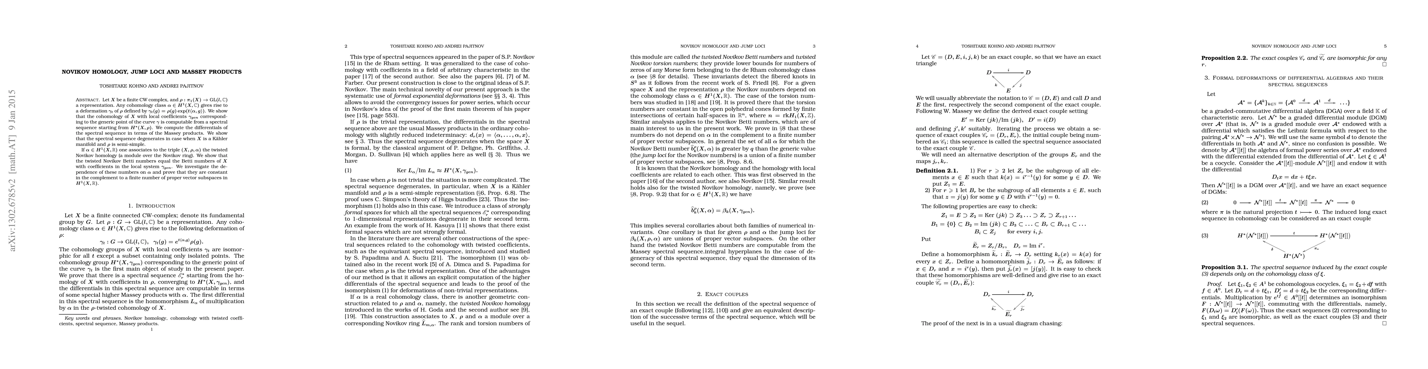 Let X be a finite CW-complex, denote its fundamental group by G. Let R be an n-dimensional complex repesentation of G. Any element A of the first cohomology group of X with complex coefficients gives rise to the exponential deformation of the representation R, which can be considered as a curve in the space of representations. We show that the cohomology of X with local coefficients corresponding to the generic point of this curve is computable from a spectral sequence starting from the cohomology of X with R-twisted coefficients. We compute the differentials of the spectral sequence in terms of Massey products. We show that the spectral sequence degenerates in case when X is a Kaehler manifold, and the representation R is semi-simple. If A is a real cohomology class, one associates to the triple (X,R,A) the twisted Novikov homology (a module over the Novikov ring). We show that the twisted Novikov Betti numbers equal the Betti numbers of X with coefficients in the above local system. We investigate the dependance of these numbers on A and prove that they are constant in the complement to a finite number of integral hyperplanes in the first cohomology group.