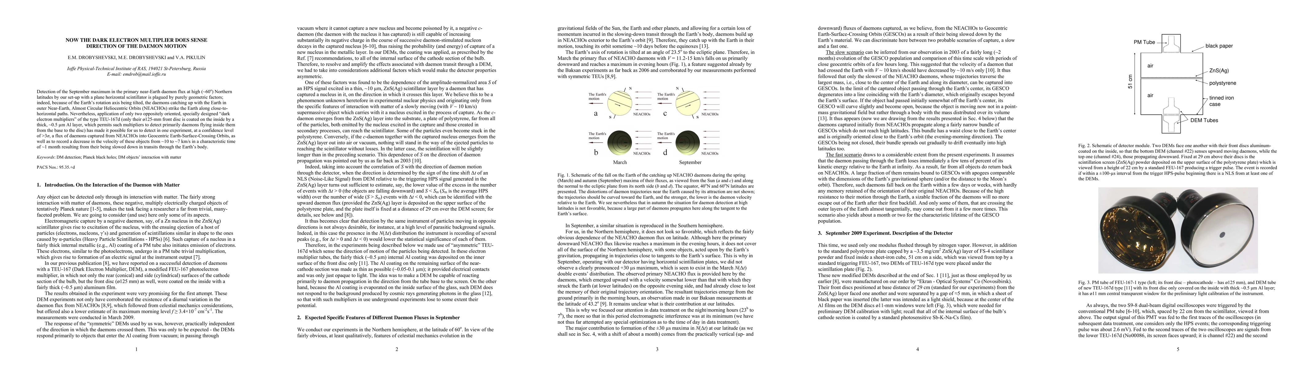 Detection of the September maximum in the primary near-Earth daemon flux at high (~60o) Northern latitudes by our set-up with a plane horizontal scintillator is plagued by purely geometric factors; indeed, because of the Earth's rotation axis being tilted, the daemons catching up with the Earth in outer Near-Earth, Almost Circular Heliocentric Orbits (NEACHOs) strike the Earth along close-to-horizontal paths. Nevertheless, application of only two oppositely oriented, specially designed "dark electron multipliers" of the type TEU-167d (only their dia.125-mm front disc is coated on the inside by a thick, ~0.5 um Al layer, which permits such multipliers to detect primarily daemons flying inside them from the base to the disc) has made it possible for us to detect in one experiment, at a confidence level of >3 sigma, a flux of daemons captured from NEACHOs into Geocentric Earth-Surface-Crossing Orbits, as well as to record a decrease in the velocity of these objects from ~10 to ~7 km/s in a characteristic time of ~1 month resulting from their being slowed down in transits through the Earth's body.