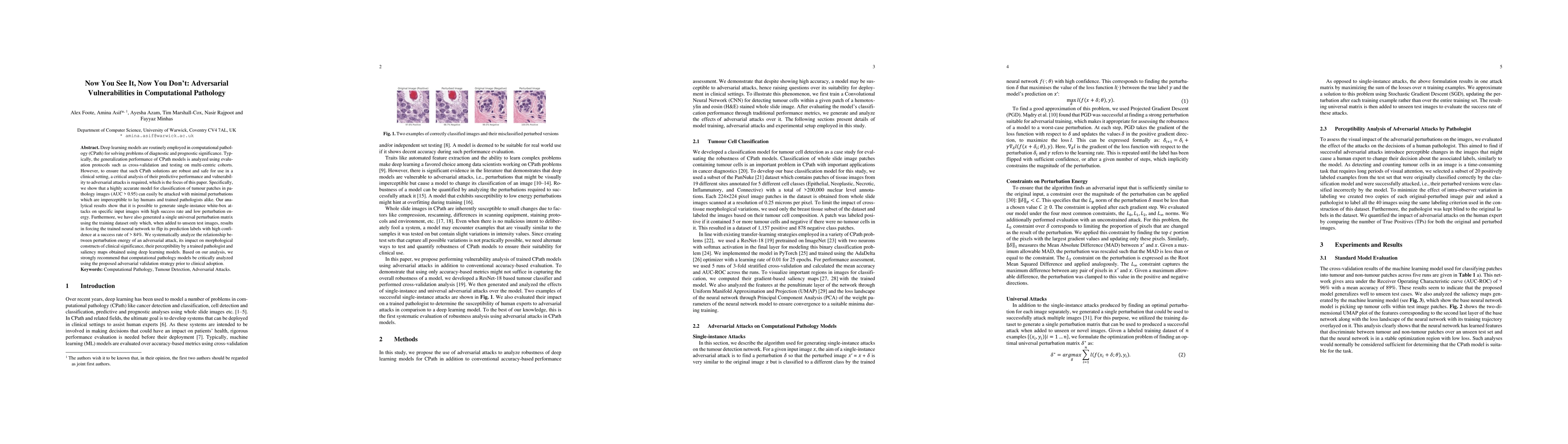 A deep learning model for tumor patch classification in pathology images is vulnerable to adversarial attacks with minimal perturbations that are imperceptible to humans and pathologists. The study recommends critical analysis of computational pathology models using adversarial validation strategy before clinical adoption.