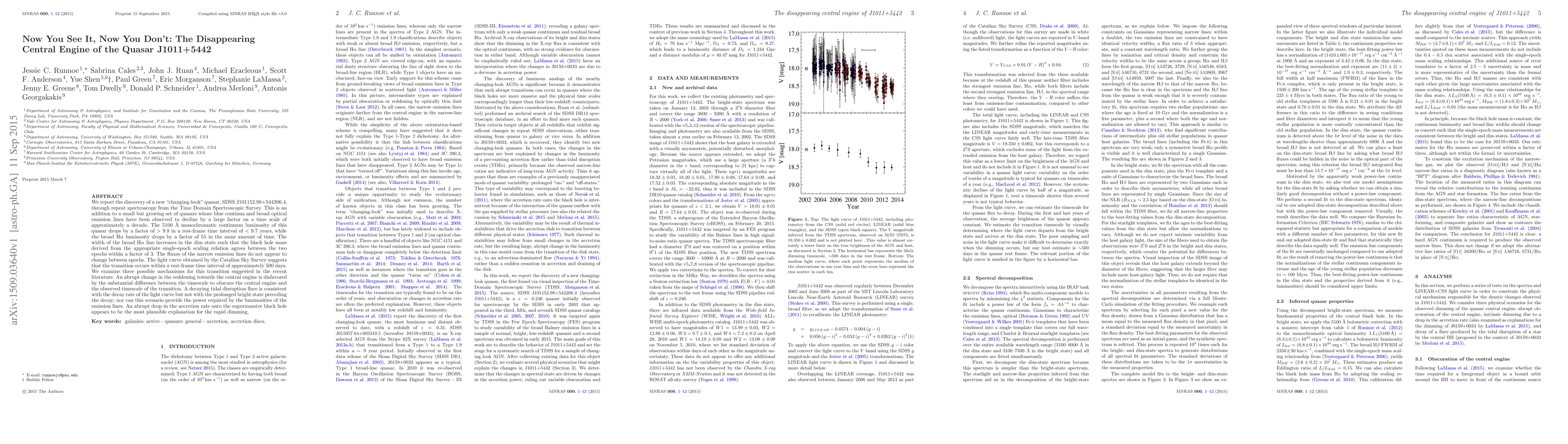 We report the discovery of a new "changing-look" quasar, SDSS J101152.98+544206.4, through repeat spectroscopy from the Time Domain Spectroscopic Survey. This is an addition to a small but growing set of quasars whose blue continua and broad optical emission lines have been observed to decline by a large factor on a time scale of approximately a decade. The 5100 Angstrom monochromatic continuum luminosity of this quasar drops by a factor of > 9.8 in a rest-frame time interval of < 9.7 years, while the broad H-alpha luminosity drops by a factor of 55 in the same amount of time. The width of the broad H-alpha line increases in the dim state such that the black hole mass derived from the appropriate single-epoch scaling relation agrees between the two epochs within a factor of 3. The fluxes of the narrow emission lines do not appear to change between epochs. The light curve obtained by the Catalina Sky Survey suggests that the transition occurs within a rest-frame time interval of approximately 500 days. We examine three possible mechanisms for this transition suggested in the recent literature. An abrupt change in the reddening towards the central engine is disfavored by the substantial difference between the timescale to obscure the central engine and the observed timescale of the transition. A decaying tidal disruption flare is consistent with the decay rate of the light curve but not with the prolonged bright state preceding the decay, nor can this scenario provide the power required by the luminosities of the emission lines. An abrupt drop in the accretion rate onto the supermassive black hole appears to be the most plausible explanation for the rapid dimming.