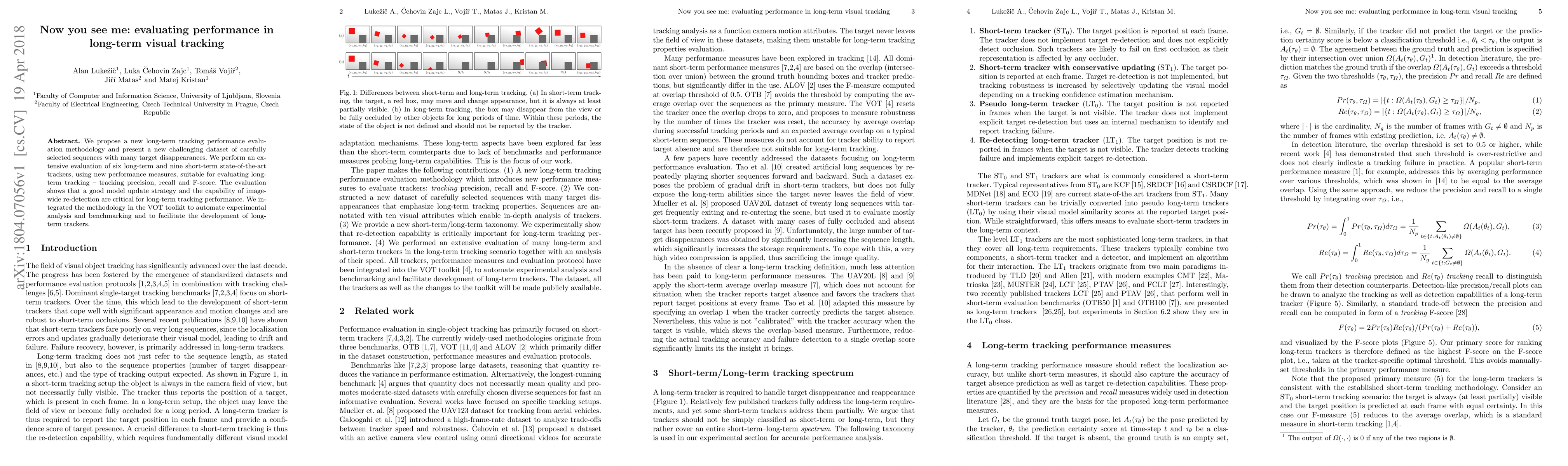 This paper introduces a new methodology for evaluating long-term visual tracking performance and presents a challenging dataset with frequent target disappearances. The evaluation of state-of-the-art trackers highlights the importance of model update strategies and image-wide re-detection for effective long-term tracking.