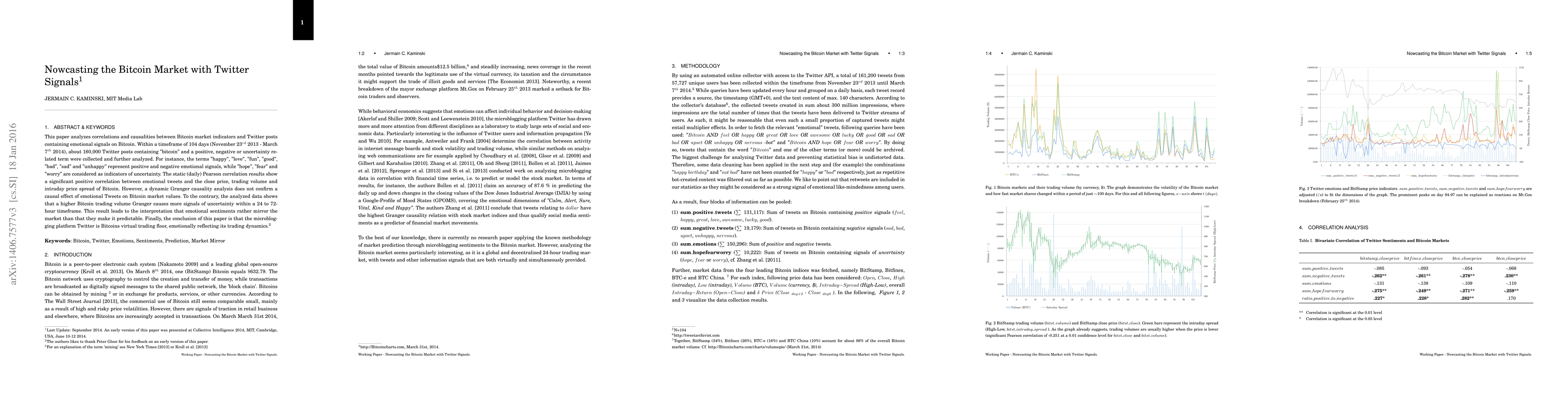 This paper investigates the correlation between Bitcoin market indicators and emotional signals from Twitter posts, finding significant positive static correlations but no causal effect from tweets on Bitcoin prices. Instead, higher trading volumes predict increased uncertainty signals on Twitter.