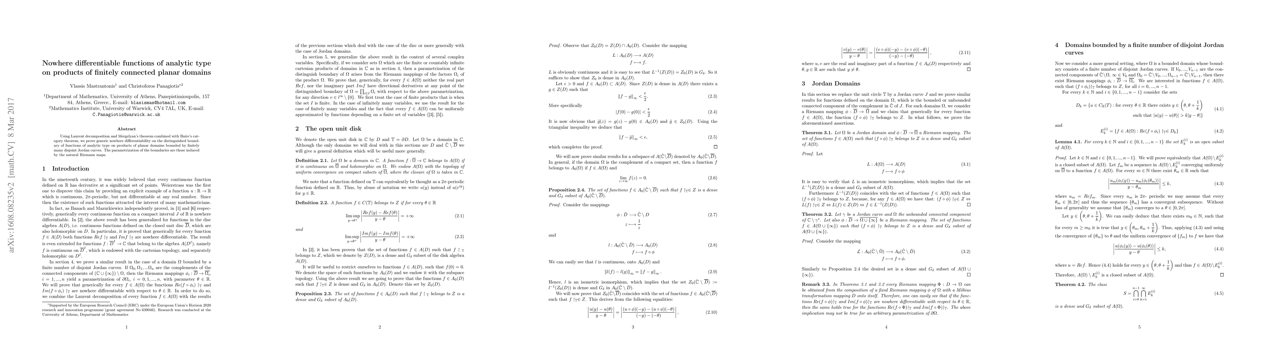 Using Laurent decomposition and Mergelyan's theorem combined with Baire's category theorem, we prove generic nowhere differentiability on the distinguished boundary of functions of analytic type on products of planar domains bounded by finitely many disjoint Jordan curves. The parametrization of the boundaries are those induced by the natural Riemann maps.