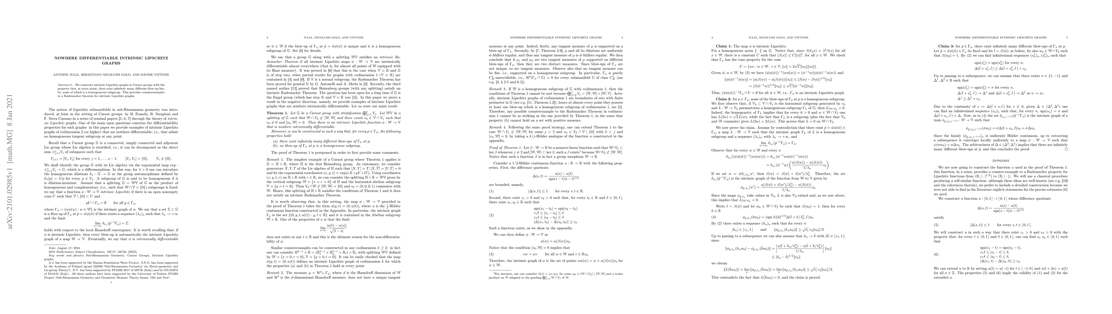 This paper constructs intrinsic Lipschitz graphs in Carnot groups that are nowhere differentiable, demonstrating infinitely many different blow-up limits at every point, none of which are homogeneous subgroups, thus disproving a Rademacher theorem for such graphs.
