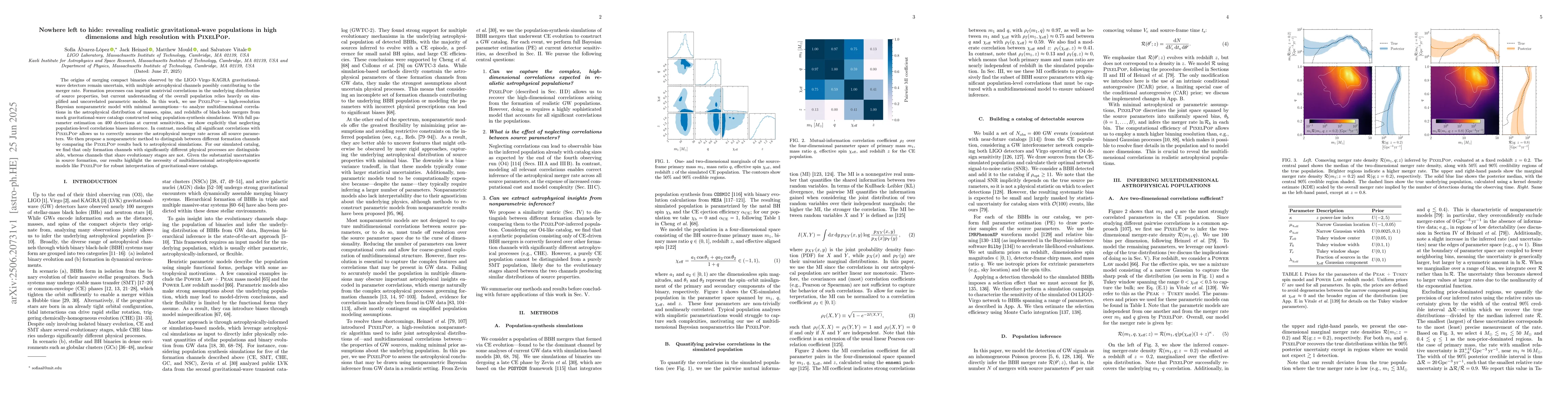 The origins of merging compact binaries observed by the LIGO-Virgo-KAGRA gravitational-wave detectors remain uncertain, with multiple astrophysical channels possibly contributing to the merger rate. Formation processes can imprint nontrivial correlations in the underlying distribution of source properties, but current understanding of the overall population relies heavily on simplified and uncorrelated parametric models. In this work, we use PixelPop-a high-resolution Bayesian nonparametric model with minimal assumptions-to analyze multidimensional correlations in the astrophysical distribution of masses, spins, and redshifts of black-hole mergers from mock gravitational-wave catalogs constructed using population-synthesis simulations. With full parameter estimation on 400 detections at current sensitivities, we show explicitly that neglecting population-level correlations biases inference. In contrast, modeling all significant correlations with PixelPop allows us to correctly measure the astrophysical merger rate across all source parameters. We then propose a nonparametric method to distinguish between different formation channels by comparing the PixelPop results back to astrophysical simulations. For our simulated catalog, we find that only formation channels with significantly different physical processes are distinguishable, whereas channels that share evolutionary stages are not. Given the substantial uncertainties in source formation, our results highlight the necessity of multidimensional astrophysics-agnostic models like PixelPop for robust interpretation of gravitational-wave catalogs.