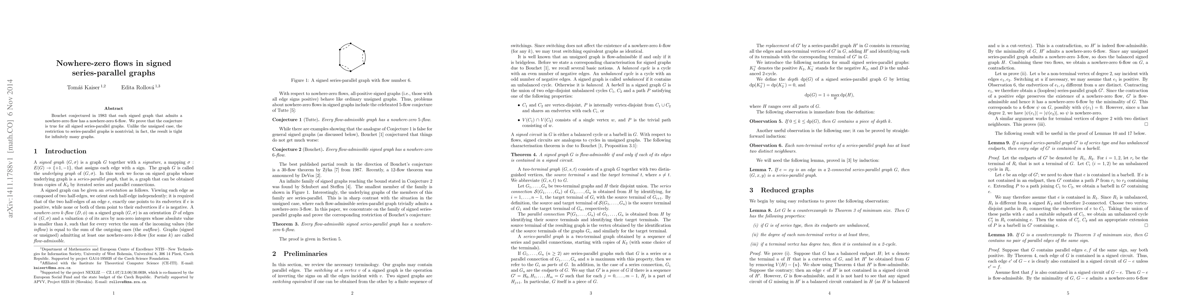 Summary: Bouchet's 1983 conjecture that every signed graph allowing a nowhere-zero flow also allows a nowhere-zero 6-flow is proven true for signed series-parallel graphs, demonstrating a nontrivial and tight result for this specific class of graphs.