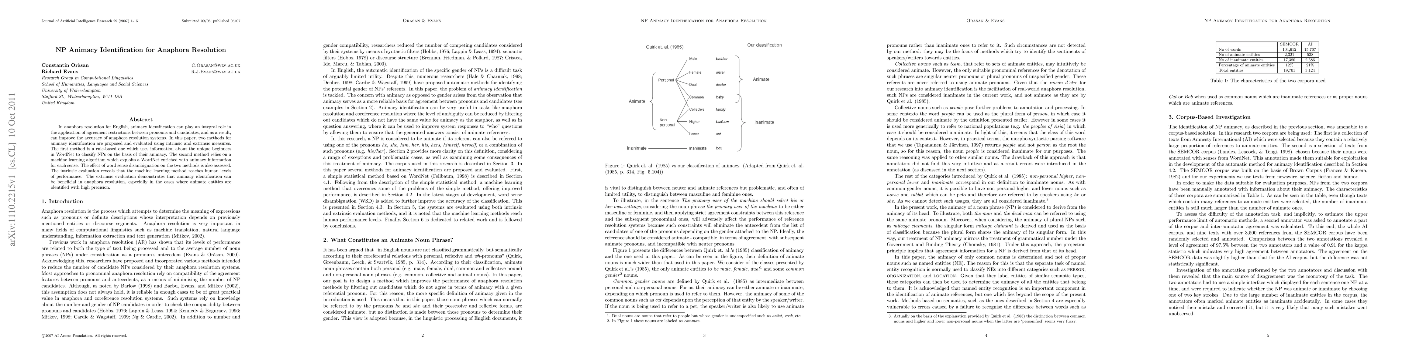 This paper proposes two methods for identifying animacy in noun phrases (NPs) to enhance anaphora resolution: a rule-based method using WordNet and a machine learning approach with WordNet enriched for animacy. The machine learning method achieves performance close to human levels and improves anaphora resolution, especially when animate entities are accurately identified.