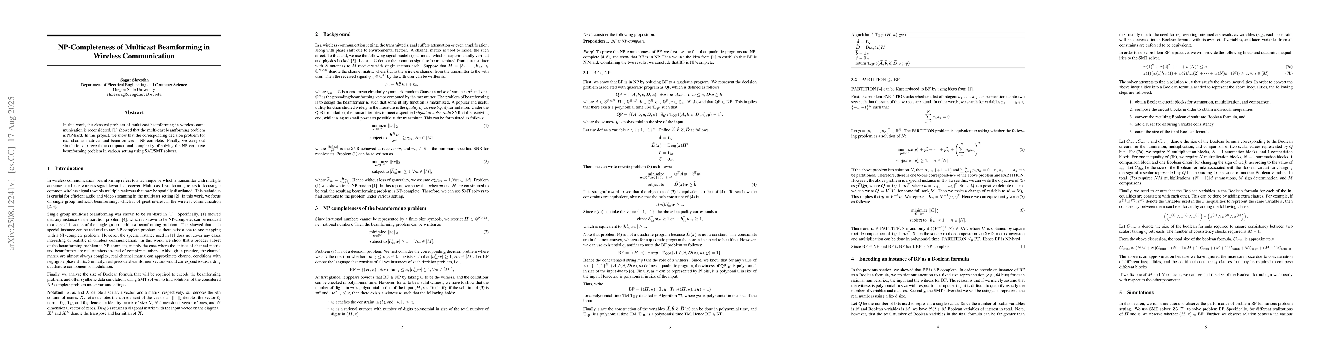 In this work, the classical problem of multi-cast beamforming in wireless communication is reconsidered. An existing work has shown that the multi-cast beamforming problem is NP-hard. In this project, we show that the corresponding decision problem for real channel matrices and beamformers is NP-complete. Finally, we carry out simulations to reveal the computational complexity of solving the NP-complete beamforming problem in various setting using SAT/SMT solvers.