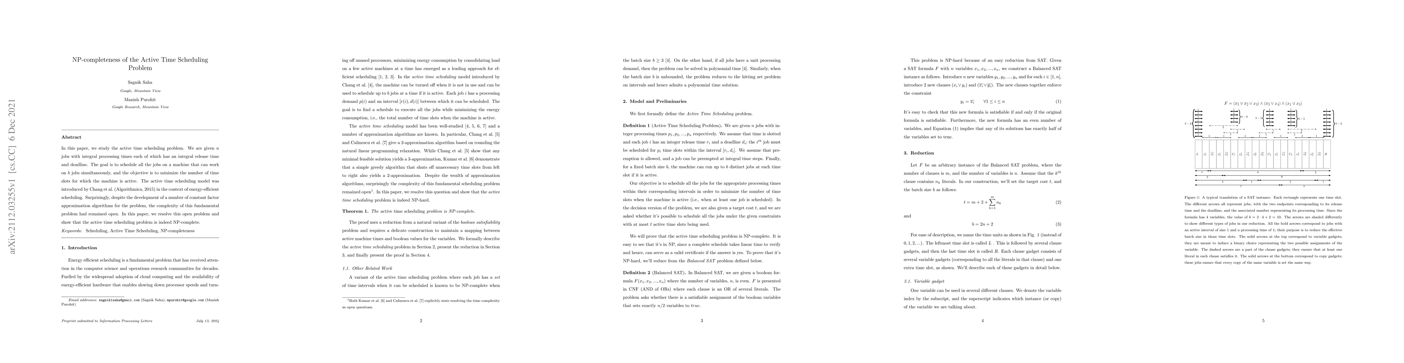 This paper proves that the Active Time Scheduling Problem, which aims to minimize machine activity while scheduling jobs with given release and deadline times, is NP-complete. Despite previous constant factor approximation algorithms, the complexity of this problem had not been determined before this study.