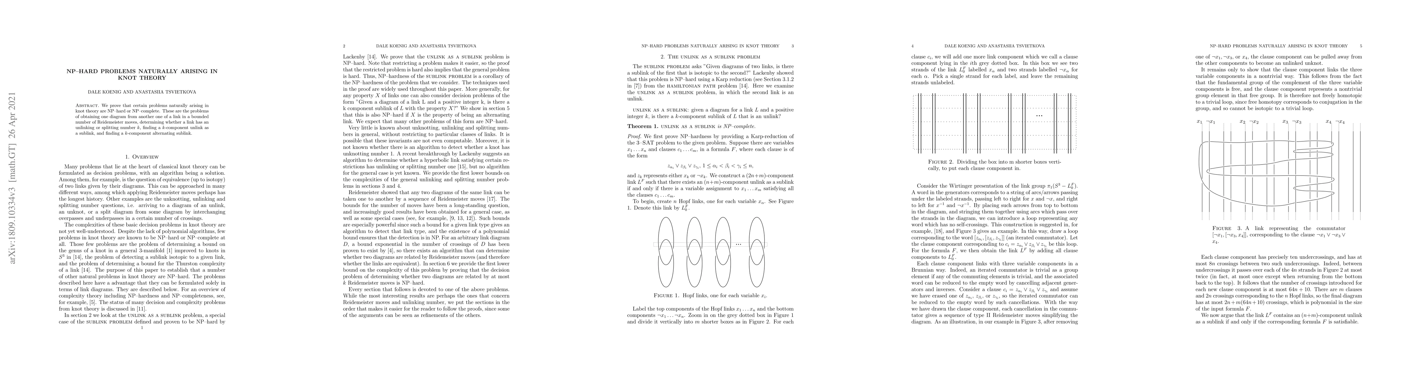 The paper demonstrates that several knot theory problems, including transformations between link diagrams and determining link unlinking or splitting properties, are NP-hard or NP-complete. These include finding a link diagram via a limited number of Reidemeister moves and identifying specific sublinks.