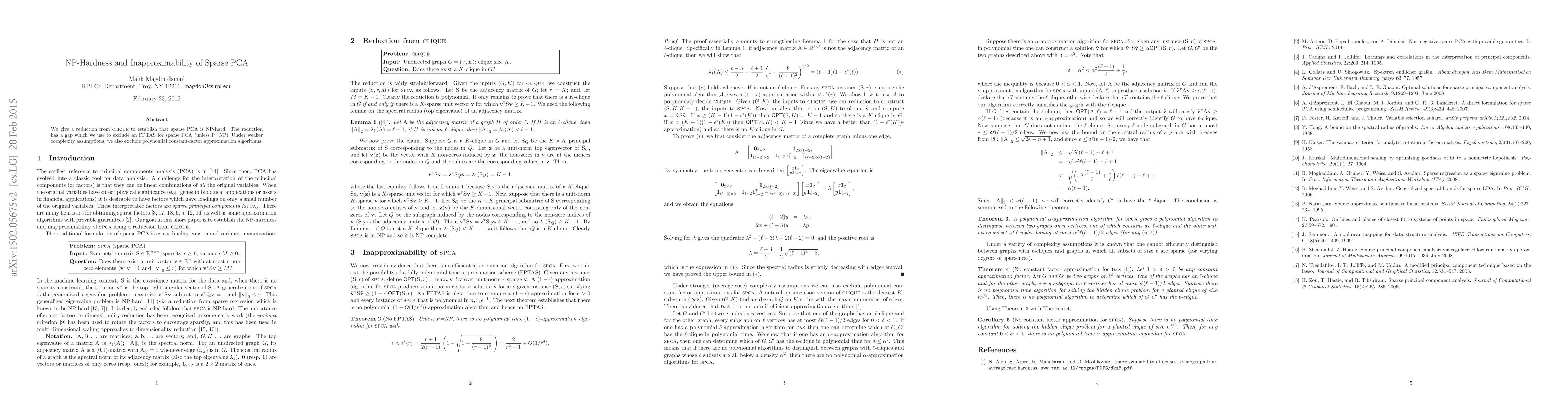 This paper demonstrates that sparse PCA is NP-hard via a reduction from the {\sc clique} problem, and it proves that no FPTAS exists for sparse PCA unless P=NP. Additionally, it shows that no polynomial constant-factor approximation algorithms can exist under weaker complexity assumptions.