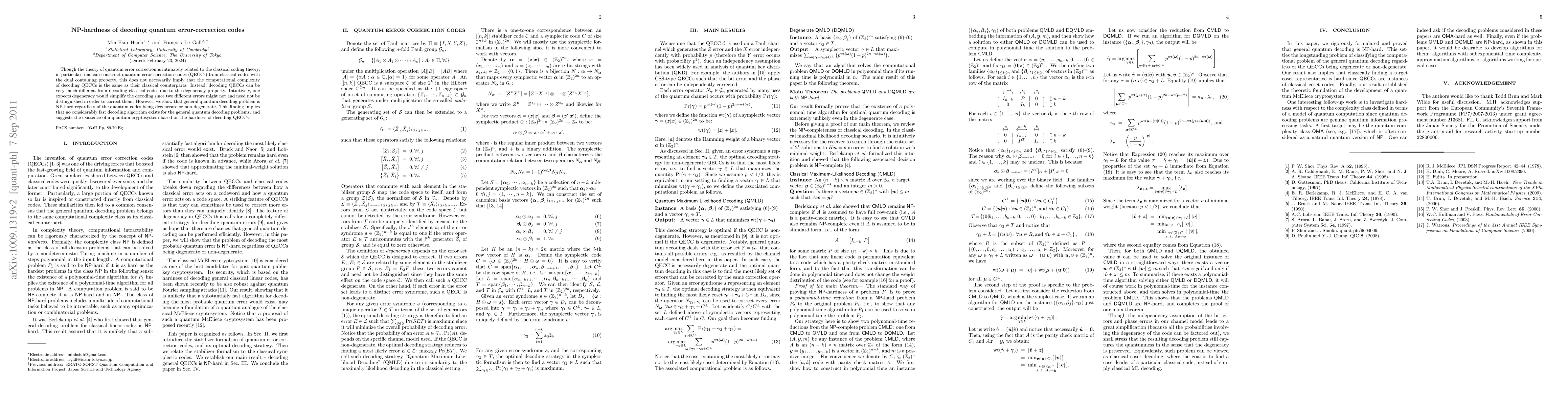 This paper demonstrates that decoding quantum error-correction codes (QECCs) is NP-hard, regardless of whether the codes are degenerate or not. This finding indicates that no significantly fast decoding algorithm exists for general quantum decoding problems, suggesting potential for quantum cryptosystems based on this computational hardness.