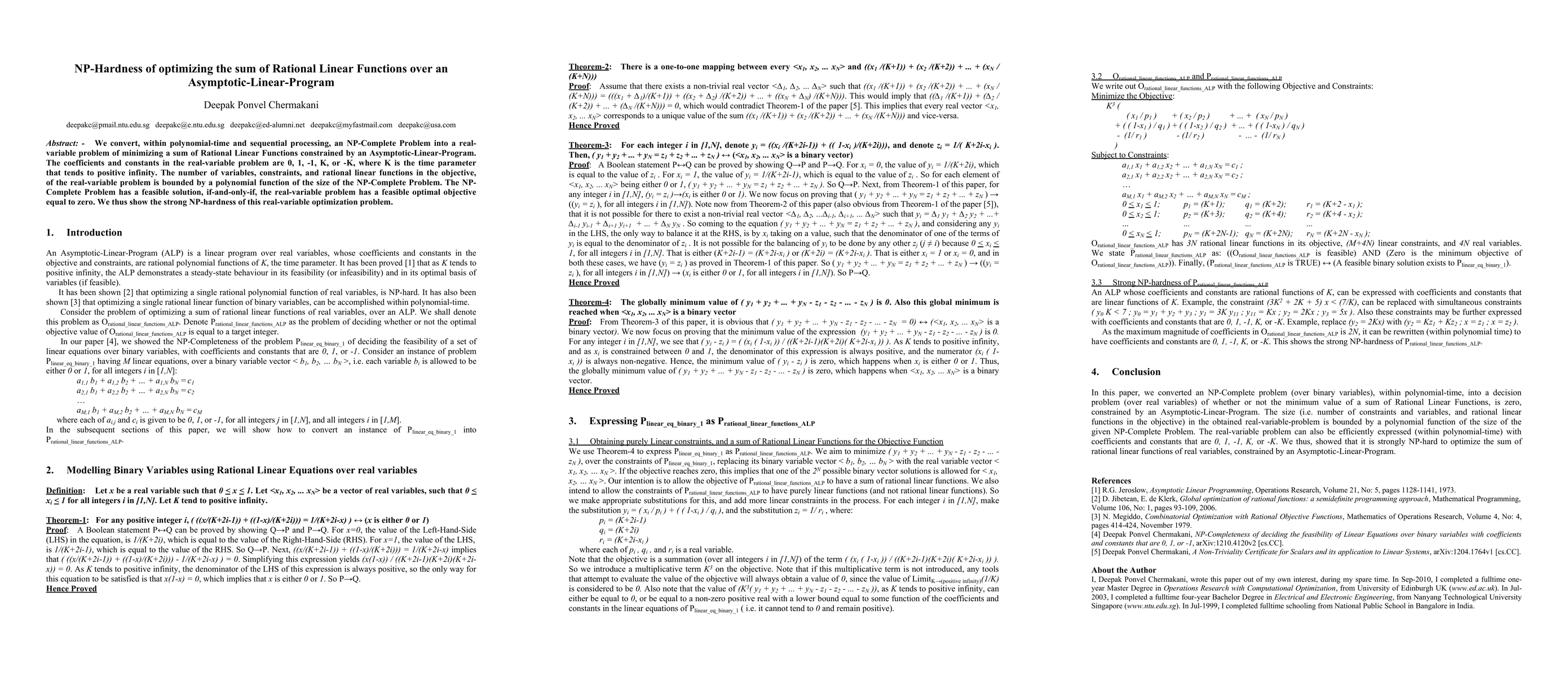 We convert, within polynomial-time and sequential processing, an NP-Complete Problem into a real-variable problem of minimizing a sum of Rational Linear Functions constrained by an Asymptotic-Linear-Program. The coefficients and constants in the real-variable problem are 0, 1, -1, K, or -K, where K is the time parameter that tends to positive infinity. The number of variables, constraints, and rational linear functions in the objective, of the real-variable problem is bounded by a polynomial function of the size of the NP-Complete Problem. The NP-Complete Problem has a feasible solution, if-and-only-if, the real-variable problem has a feasible optimal objective equal to zero. We thus show the strong NP-hardness of this real-variable optimization problem.
