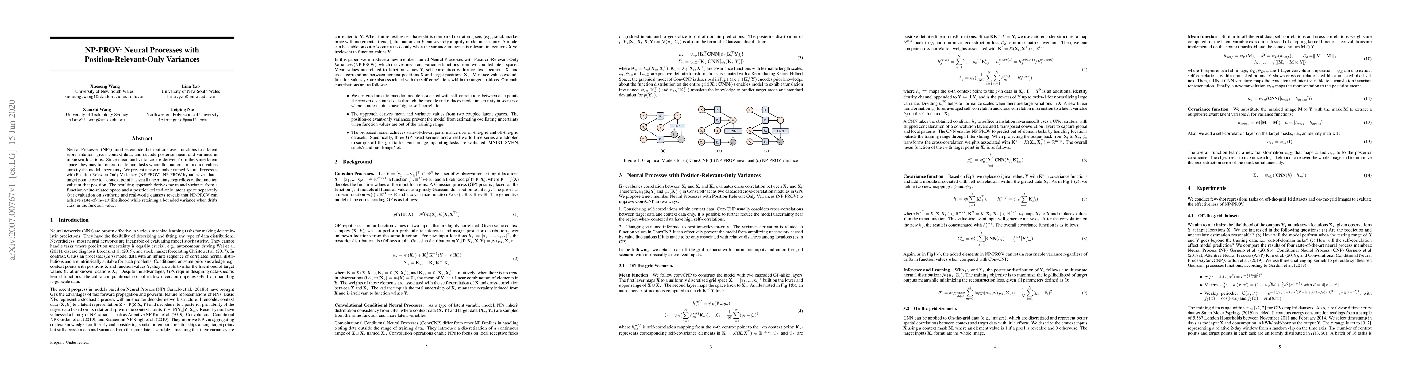The paper introduces Neural Processes with Position-Relevant-Only Variances (NP-PROV), a new model variant that separates mean and variance derivation in Neural Processes. NP-PROV assumes that a point near context points has small uncertainty, irrespective of function value. Evaluations on synthetic and real-world datasets show NP-PROV achieves superior likelihood and maintains bounded variance even with function value drifts.
