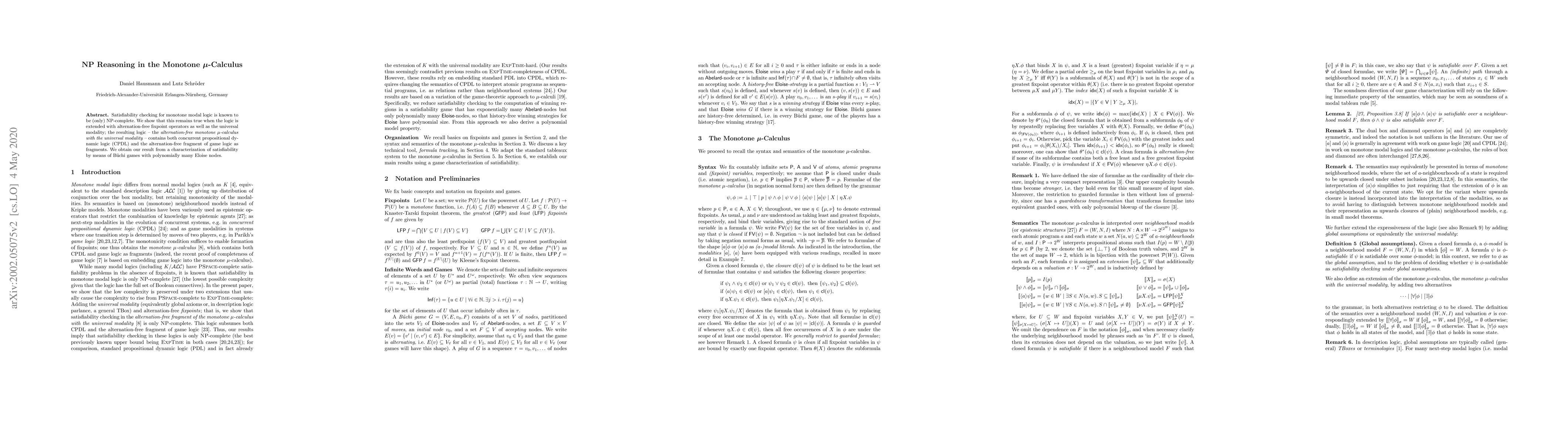 This paper demonstrates that satisfiability checking for the extended monotone $\mu$-calculus, which includes aconjunctive and alternation-free fixpoint operators along with the universal modality, remains NP-complete. The logic encompasses both concurrent propositional dynamic logic and the alternation-free fragment of game logic, with satisfiability being characterized via B\"uchi games with polynomially many Eloise nodes.