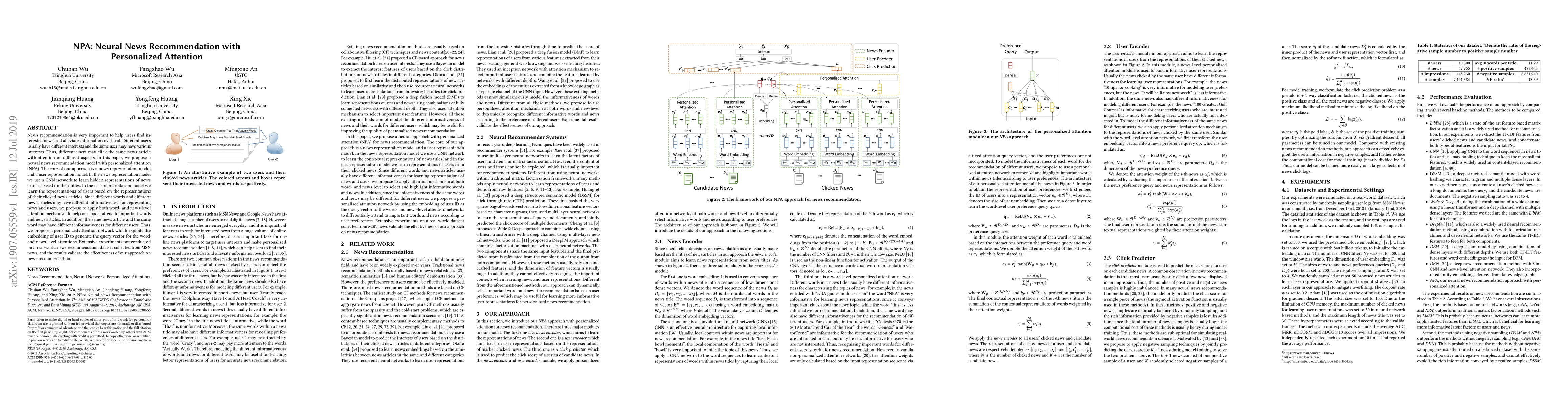 This paper introduces NPA, a neural news recommendation model utilizing personalized attention mechanisms to cater to varying user interests by combining CNN-based news representations and user representations enhanced with word- and news-level attention, showing improved performance on a real-world dataset.