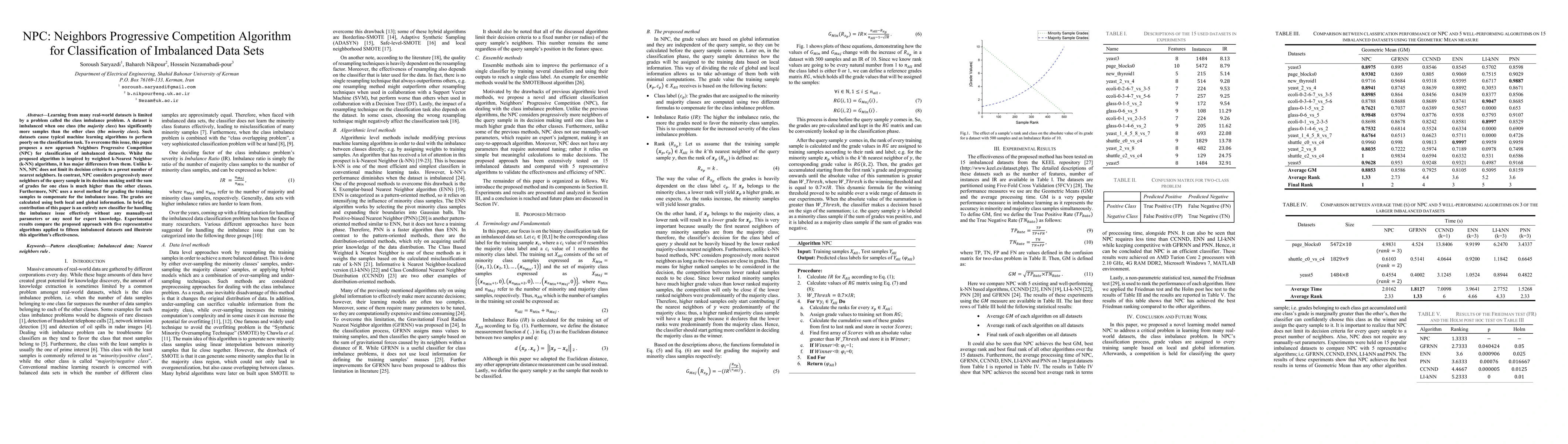 The paper proposes a novel Neighbors Progressive Competition (NPC) algorithm for classifying imbalanced datasets, which progressively considers more neighbors and grades samples using local and global information to outperform traditional k-NN methods. Experimental results show NPC's effectiveness across multiple datasets compared to five other representative algorithms.