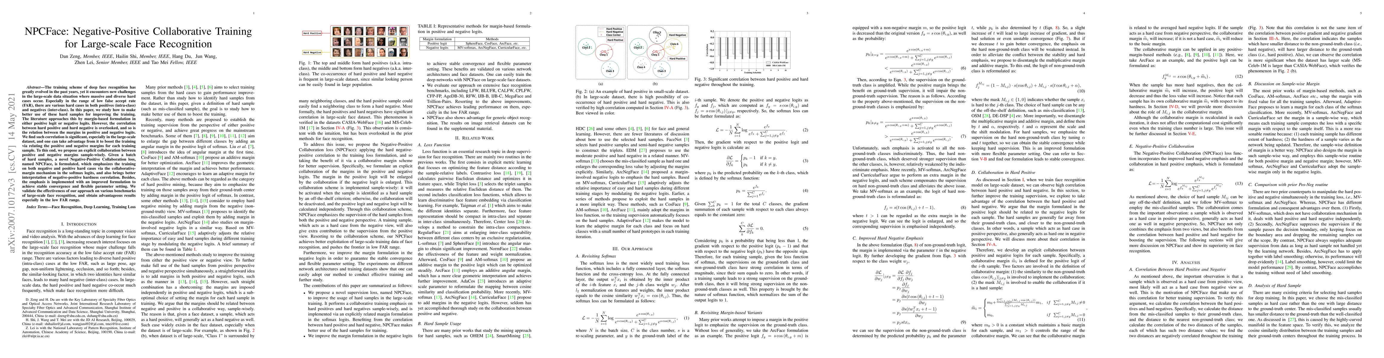 The paper proposes NPCFace, a novel Negative-Positive Collaborative Training loss that leverages the correlation between hard positive and negative samples to enhance large-scale face recognition training. The method achieves stable convergence and better performance, particularly at low false accept rates, by explicitly collaborating between positive and negative margins in softmax logits.