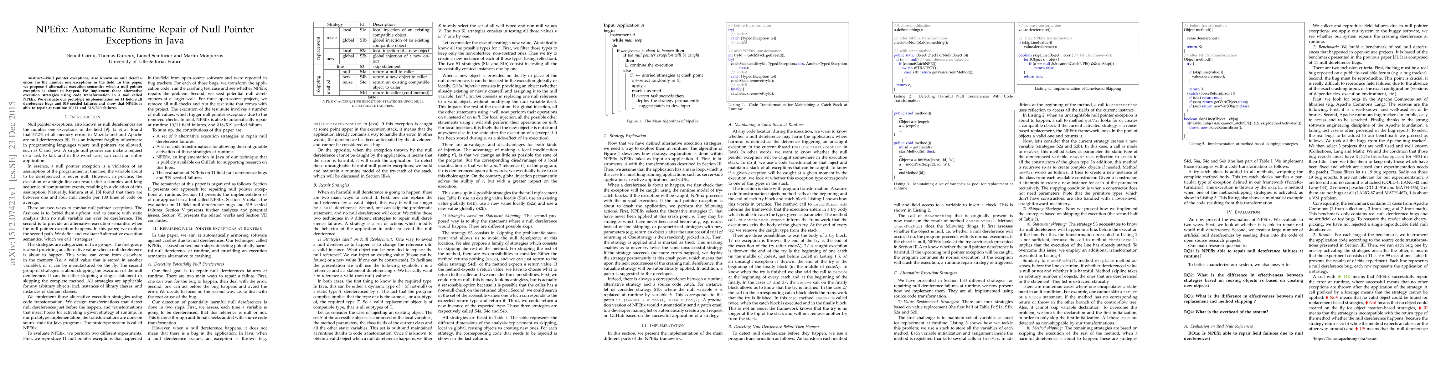 The research introduces NPEFix, a tool that automatically repairs null pointer exceptions in Java at runtime. Through code transformation, it implements alternative execution strategies for such exceptions, successfully repairing 10 out of 11 field bugs and 318 out of 519 seeded failures in evaluations.