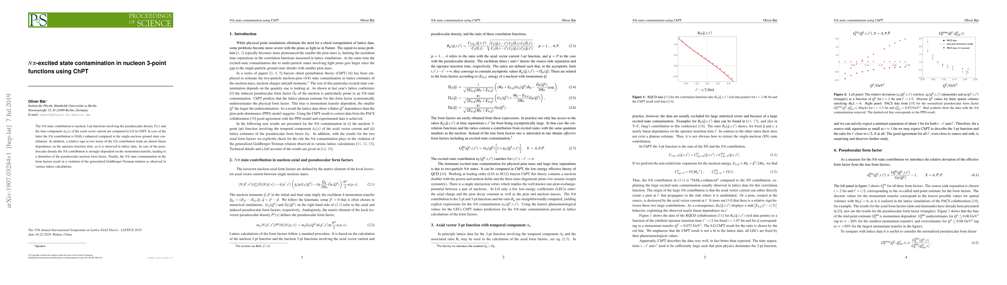 The $N\pi$-state contribution to nucleon 3-pt functions involving the pseudoscalar density $P(x)$ and the time component $A_4(x)$ of the axial vector current are computed to LO in ChPT. In case of the latter the $N\pi$ contribution is O($M_N$) enhanced compared to the single-nucleon ground state contribution. In addition, a relative sign in two terms of the $N\pi$ contribution leads an almost linear dependence on the operator insertion time, as it is observed in lattice data. In case of the pseudoscalar density the $N\pi$ contribution is strongly dependent on the momentum transfer, leading to a distortion of the pseudoscalar nucleon form factor. Finally, the $N\pi$ state contamination in the form factors result in a violation of the generalized Goldberger-Treiman relation as observed in various lattice calculations.