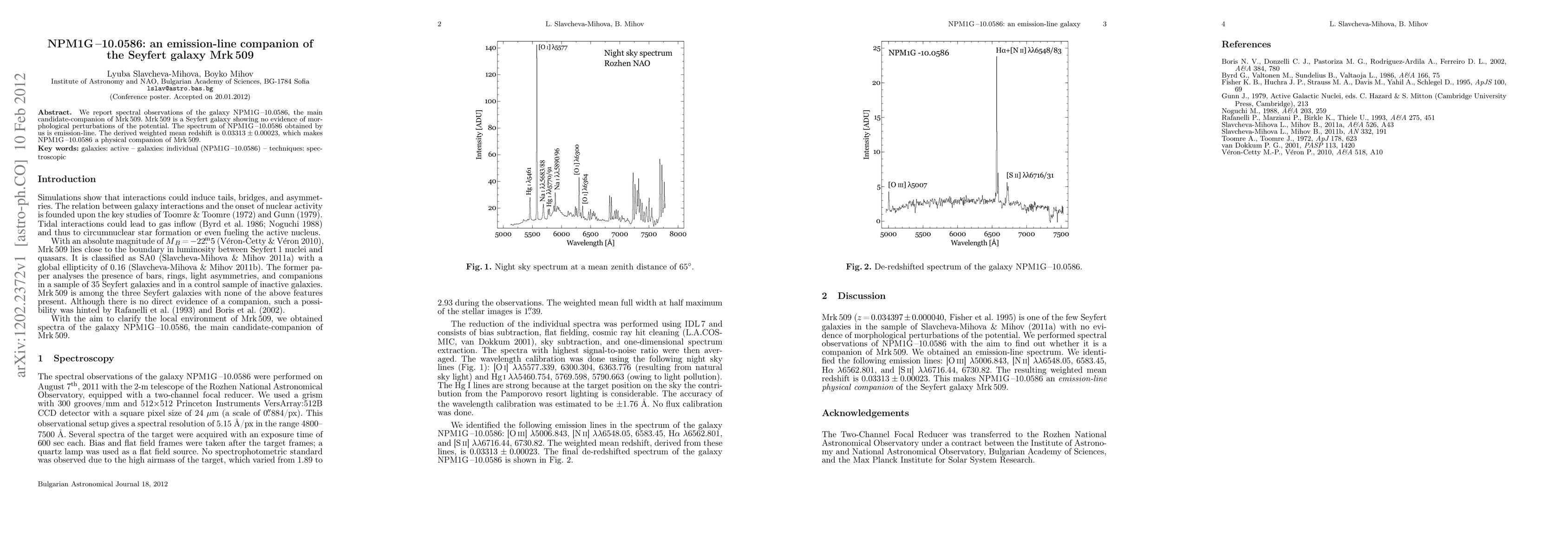 We report spectral observations of the galaxy NPM1G -10.0586, the main candidate-companion of Mrk 509. Mrk 509 is a Seyfert galaxy showing no evidence of morphological perturbations of the potential. The spectrum of NPM1G -10.0586 obtained by us is emission-line. The derived weighted mean redshift is 0.03313 +- 0.00023, which makes NPM1G -10.0586 a physical companion of Mrk 509.
