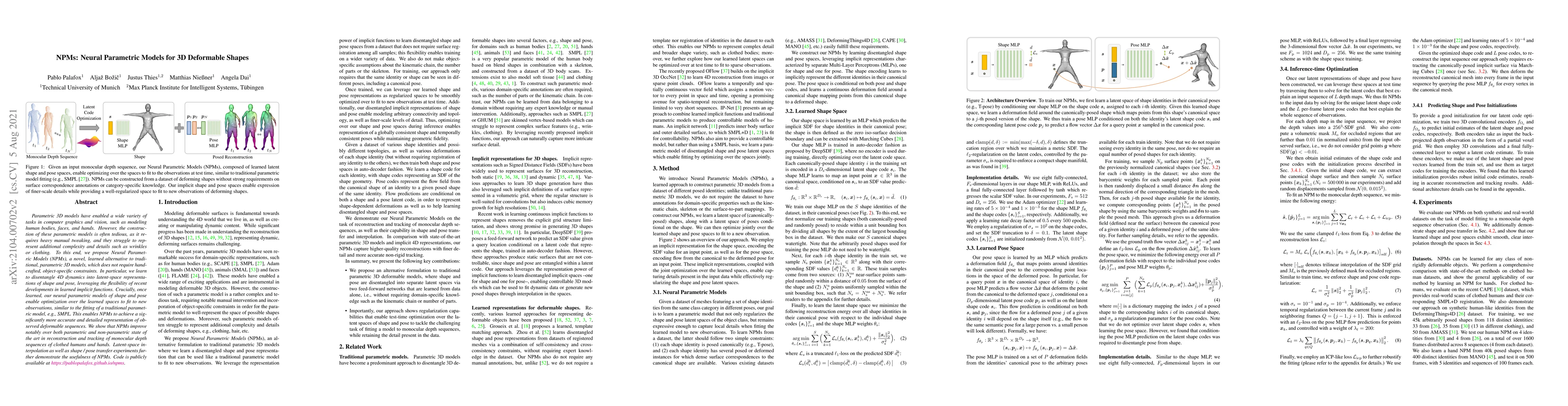 The paper introduces Neural Parametric Models (NPMs) as a learned alternative to traditional parametric 3D models for deformable shapes, enabling more accurate and detailed representations without manual tweaking. NPMs disentangle 4D dynamics into latent-space representations, achieving superior reconstruction and tracking performance in monocular depth sequences.